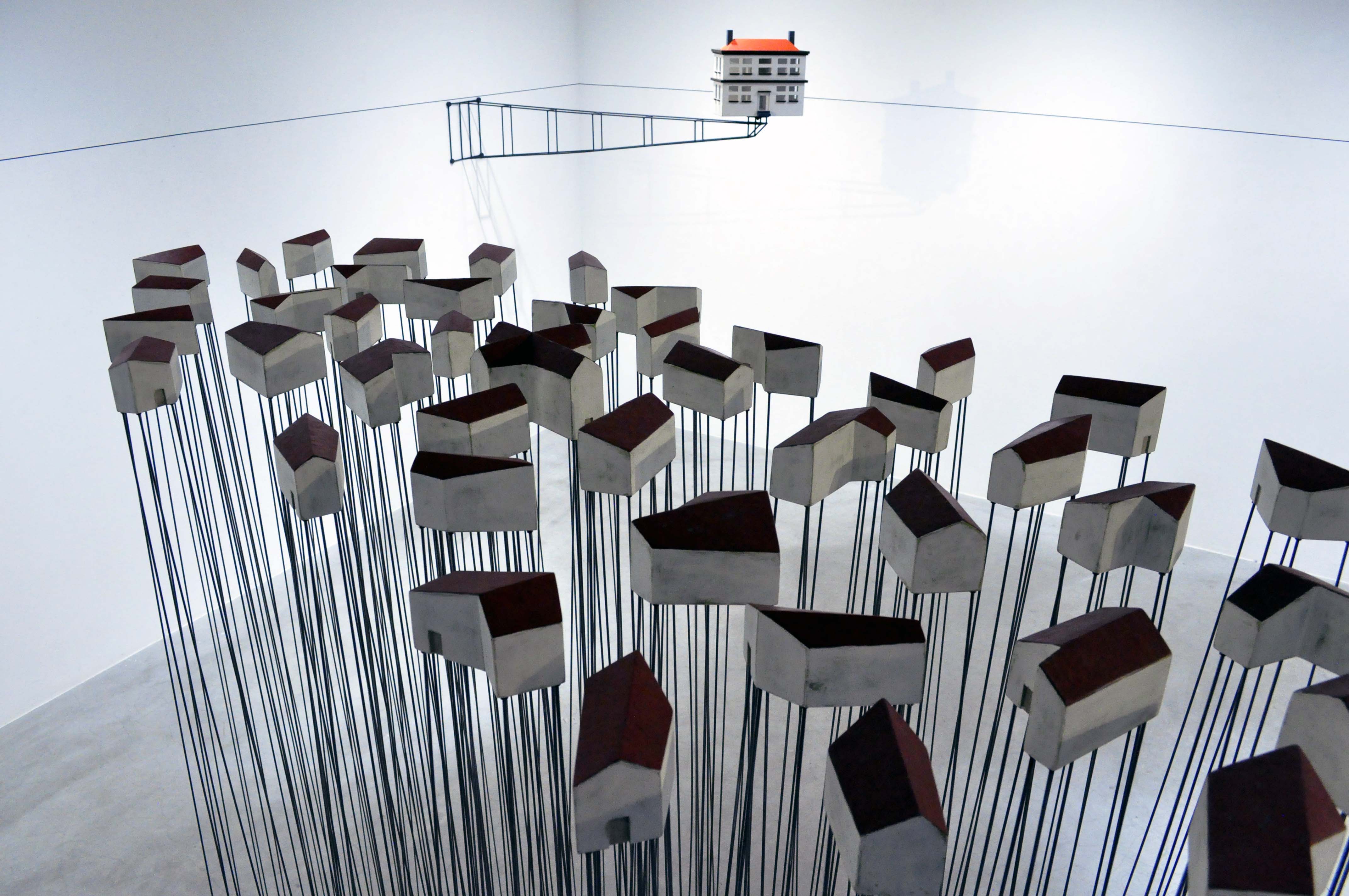 角文平ほど明快な作品を製作するアーティストはあまりいないのではないだろうか。作るというよりも日常のものを組み合わせることが彼の製作である。モチーフは家、クレーン、お土産の大阪城や木彫りの熊、椅子に戦車。誰が見てもそれ以外の何物ではない。しかしそれら日常的なものがこの作家の手にかかるととたんに日常のものではなくなる。日常品の組み合わせというとロートレアモンの「手術台の上のこうもり傘とミシンの出会いのように美しい」という言葉を思い出すが、角の作品にはシュルレアリストたちのような彼らの「美しさ」の地平を目指す気配は全くない。もちろん現代でも多くの作家が異なる日常のものを組み合わせている。そして結果的には妖怪のようなボッシュの絵や百器夜行の絵巻に出てくるような異形のどろどろした変態が生まれる場合が多い。アニメーションや漫画などポピュラーカルチャーでも近年こうしたモチーフが現れることが多いようである。一方、角の作品はこれらの系譜とはまったく印象が異なる。ユーモアを感じると同時に、非常にさっぱりしている。例えば発芽のシリーズでは木彫りの熊、椅子、引き出し、ブラシ、とあらゆるものから芽が伸びてゆく。盆栽をモチーフとした作品では綺麗に送電線を支える鉄塔が松のようにゆがんで植木鉢から立ち上がっている。