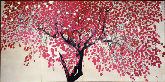 1912年広島に生まれた玉樹は、早くから絵の才能を開花し、彫り師であった父の勧めもあって上京、日本画の巨匠、速水御舟・小林古径の薫陶を受けました。その後、シュルレアリスムや抽象主義を導入しつつ自由な表現を追求した歴程美術協会の結成に参画し、歴程第1回展(1938年)に出品したのが四曲一隻屏風《花の夕》です。玉樹は後年この絵について、花を勢いよく描いてその間に枝を通していく手法で、2週間余りで仕上げたが、「まさに自分の絵でした」と述べているように、現代日本画の精髄を感じさせる逸品です。