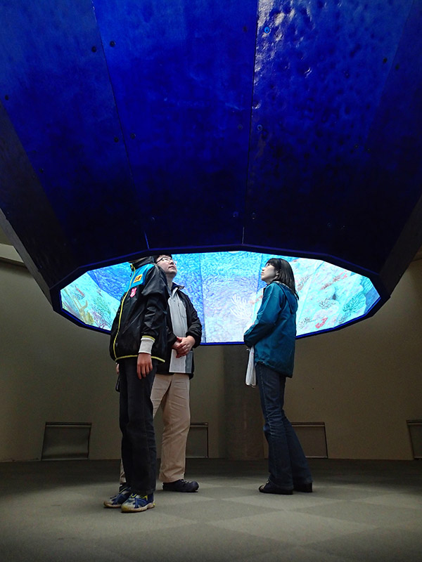 今年の3月末にオープンした瀬戸内国際芸術祭2013では秋まで小豆島で吉田の作品を展示している。高さ4メートル以上もある巨大な円錐が逆さまに天井から吊るされている。観客が身を屈めながら円錐の内側に入ると一面の海の中の風景が飛び込んでくる。この作品を描くために吉田は幾度も小豆島の海に潜ったそうだ。潜るストロークが勢いよく描くストロークに切り替わっていると思われるほど作品は生き生きとしている。視線をずっと上げると円錐の上部に島が立体的に飛び出しているのが分かる。遠くて詳細は見えないが島はもはや四角いパネルに描かれているのではなく、輪郭にそって切り抜かれているのが分かる。