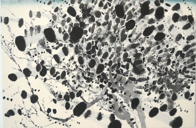 藍がひそやかに使われている部分は、墨と墨の間にさらなる奥行き感を生み出しています。画面の裏側から描くため、ある程度計算されたものでありながら、紙の滲みこみ具合いが生み出す効果によって作品の表情が異なってくるということをリアルに伝えてくれます。どこかユーモラスな動きもあり、古今東西描かれてきたTree of Lifeを想起させます。樹幹の肥痩と相まって視線を奥へと引き込んでいくこの作品は、見るものの眼を惹きつけずにはおかない秀逸な一点ではないでしょうか。