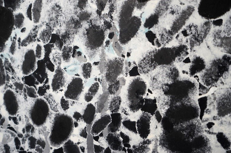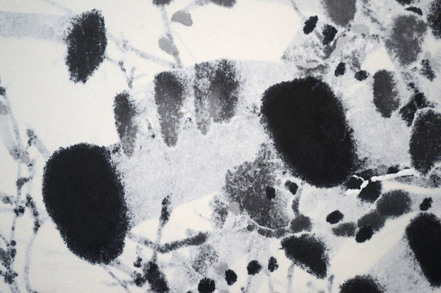 浅見さんの作品は、一見すると力強く即興的な絵に見られがちです。しかし実際には、主に和紙の裏から墨を置き、非常にゆっくりと筆を走らせます。その滲みが画面の表側から見えてくるところに特徴があります。作家は偶然みつけたというこの方法を何年間もかけて磨きあげ、描いているものと見えるはずのものの間に豊かな想像力を働かせながら多くのバリエーションを生み出してきました。