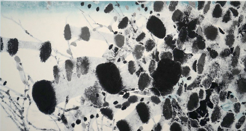 今回の展覧会においてその作品群を見ていくとこれまでとは異なり、墨以外の色が使われていることに気が付きます。上辺にうっすらとみえる青い帯は、藍と胡粉を混ぜた絵具で裏から彩色され白と黒との間にさらに空間を感じさせる効果を生んでいます。宵の澄んだ空気をわずかな色とそのにじみで表現しています。