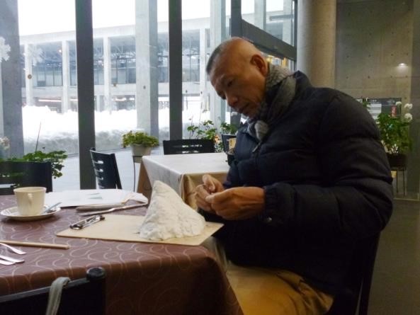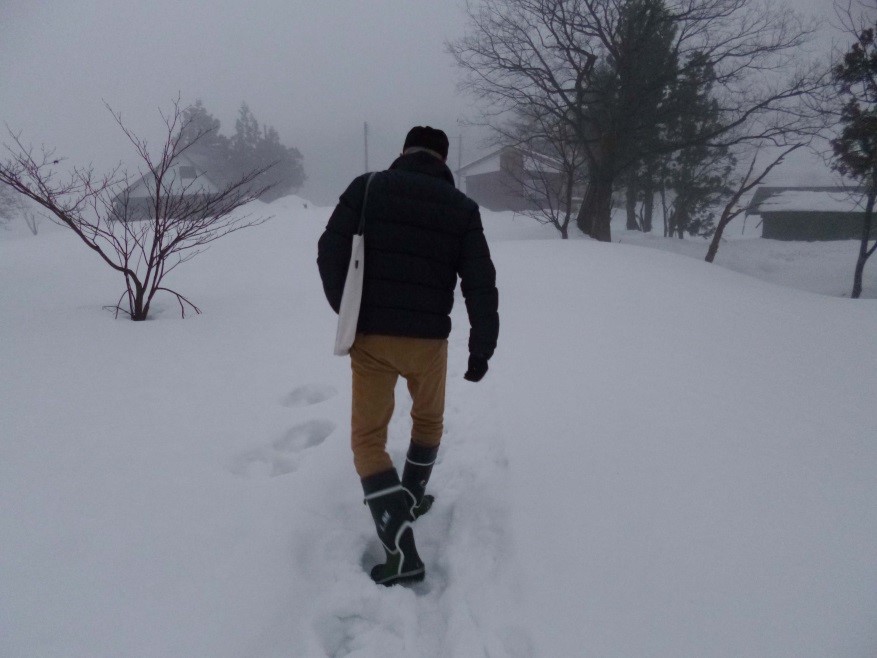 そして、降りしきる雪の中、伝統民芸品の藁細工を見に出かけました。どんなアイディアが浮かんだのでしょうか。