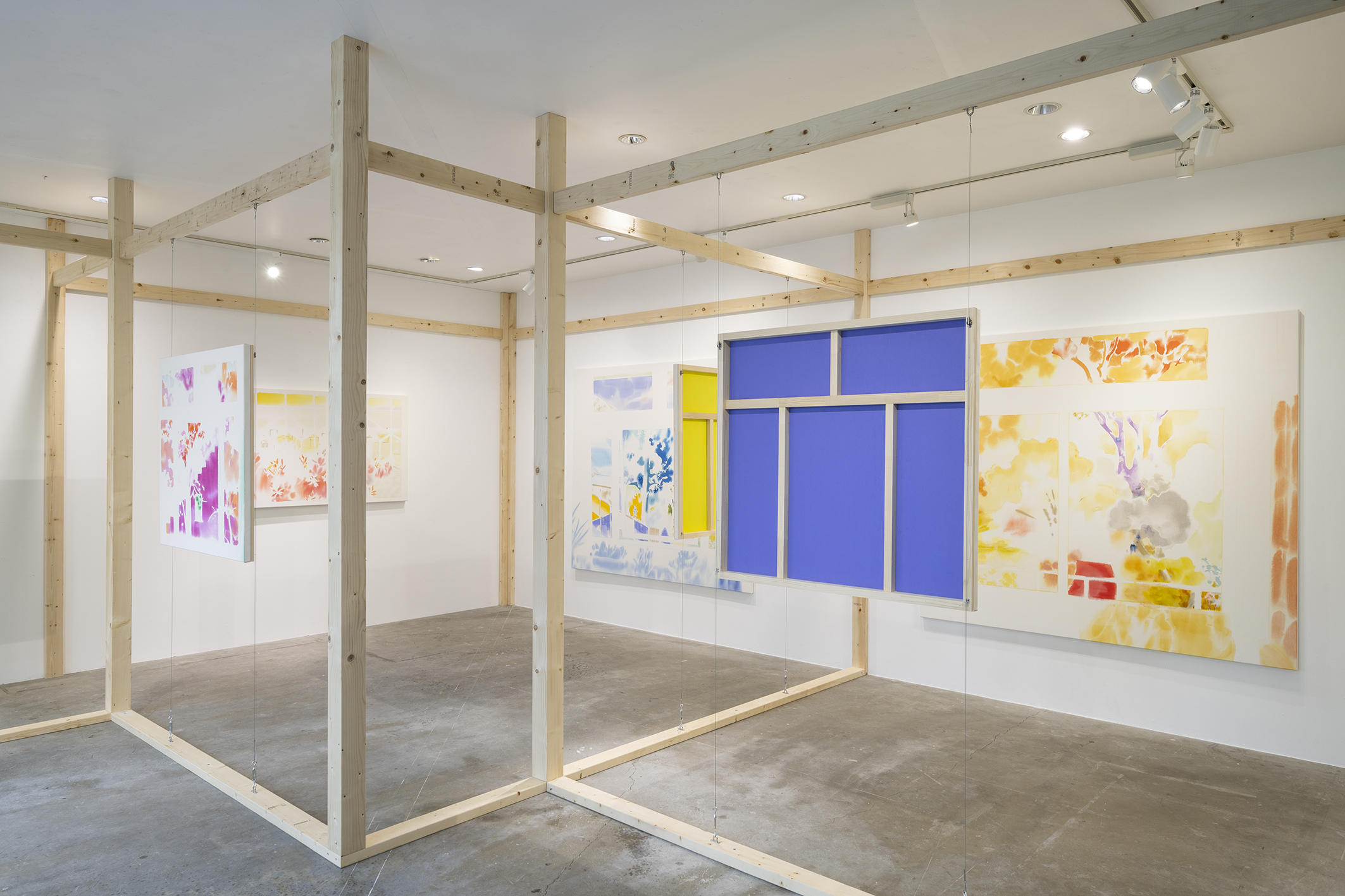 N:今回は、絵を壁にかけるだけではない展示にしたかったんです。といってもあくまで絵をみるための展示にしたかった。普段の絵を吊るだけだったらこのモチーフと見せ方がちぐはぐになるような気がして、何を描けばよいか考えたときに、窓枠を思いつきました。窓枠を描けば、そこにも架空の壁があるかのように感じ、絵は垂直に掛かっているという既視感をもってインスタレーションを見られるのではないかと思いました。展示とモチーフの一番いい組み合わせを探っている間にできあがっていった感じです。