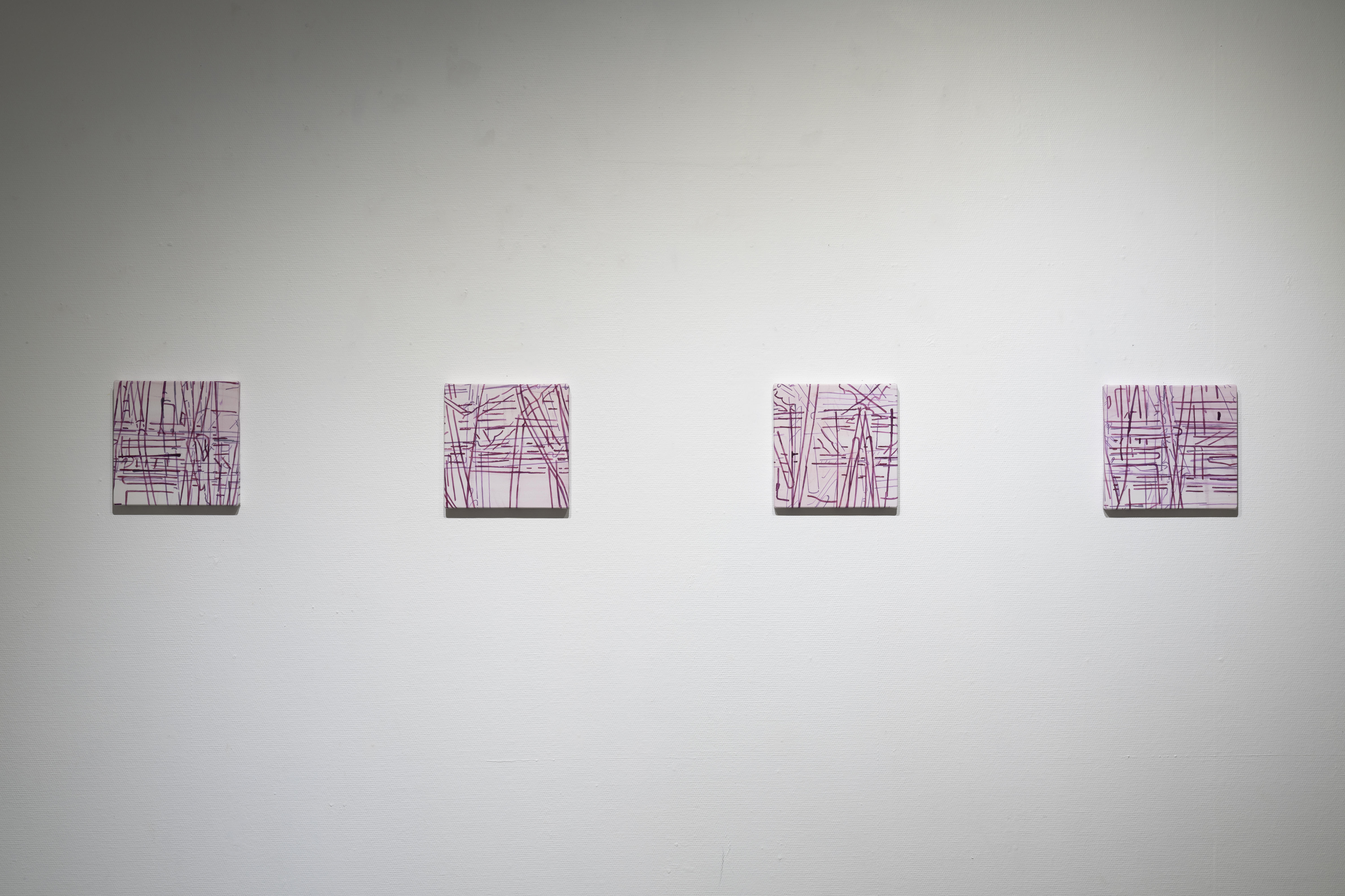 Pre-illuviation #1-4 キャンバスにアクリル、墨、グラファイト, 180x180mm, #4は180x192mm 展示風景 撮影:加藤健