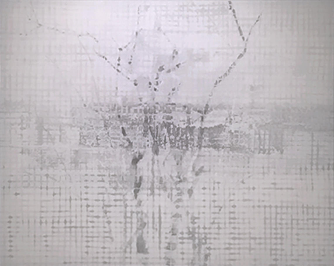 これは格子状の網目で画面を覆うという、今までにない作品でした。画面全体をグレーの「網戸」で埋め、さらに樹木・背景の地が描かれます。
