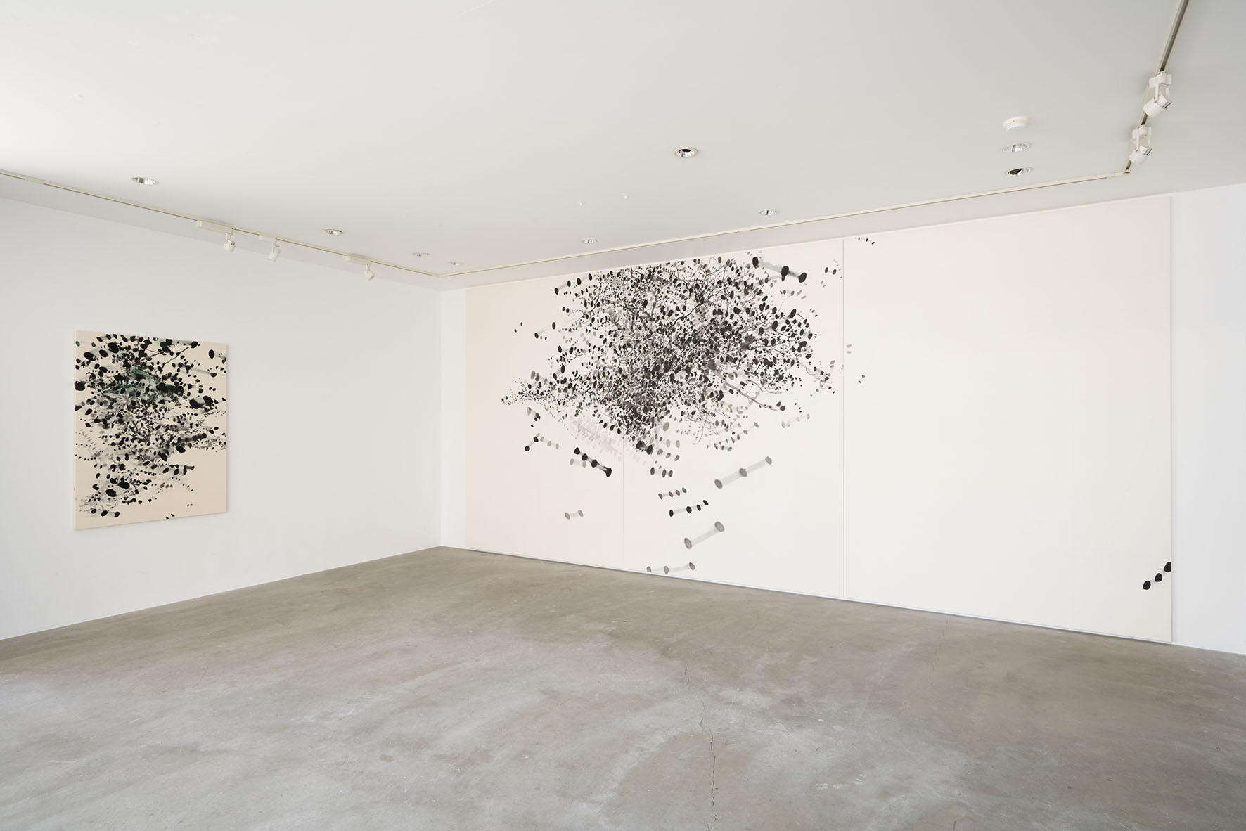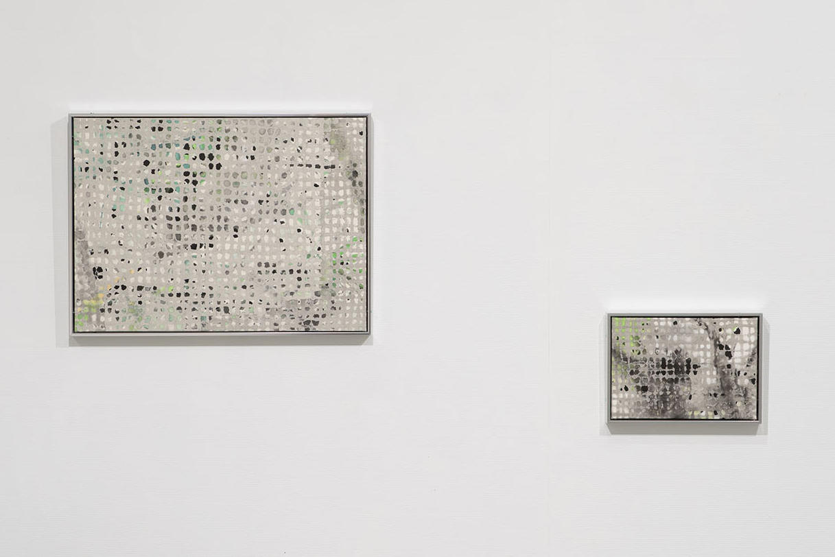 また、網戸を越えて点々が浮かぶ《gray net 191201》、葉の落ちた枝のかたちを描く《gray net 200101》から《gray net 200201》まで多少の諧調のバリエーションを持ちながら作品を描き切り、展示されている様は連作性を感じさせます。
