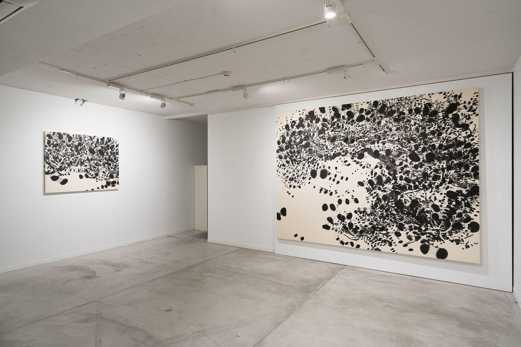今回中村屋サロン美術館での中心となっている樹木は梅の木。松や竹、桜、花蘇芳と共に作家が好んで描いている木です。何度も繰り返しスケッチをして木の構造を把握したら画面に描き出すといいます。和紙の裏側に樹木の骨格を描き写した後に、 樹木の葉などを墨の点々によって重ねていきます。一度おかれた墨の痕跡は消せず、時折おもての様子を確認しながら点々を重ねていきます。作家によれば、紙の滲み方は、同じ麻紙でも雲肌麻紙・白麻紙といった種類や、紙の状態によって染み込みに大きな違いがあるそうで、できあがりに僅かな差異が生まれるとのこと、いわば紙との対話を繰り返しながら作品ができあがっていきます。