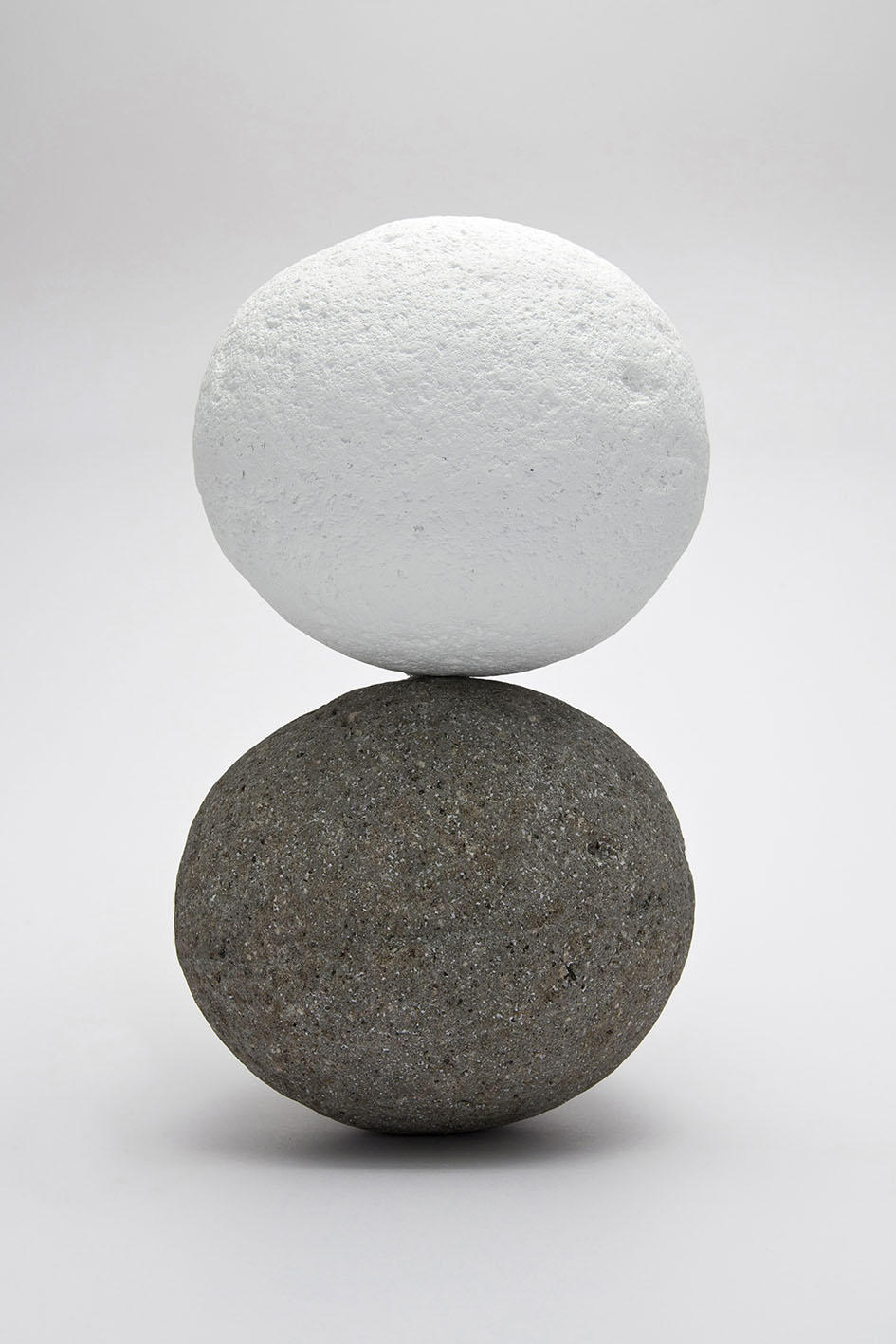 K:この石は、越後妻有地域を流れる信濃川の石です。信濃川の石は、まんまるとしていてかわいいので素材にしたいと思いました。石をかたどりして、白い樹脂にして石の上に載せています。雪だるまに見えると思いますが、雪が積もっている状態のことをテーマにした彫刻作品にしたいと考えて制作しました。降り積もっている雪の形は、その下にあるものに影響されてうまれる形です。いってみれば、積雪が生み出した形の原型が下にあるわけです。この石の作品では、そういった状態を表現しています。石を組み合わせることで、時間の感覚も複雑にさせています。石が長い年月をかけてこの形になるまでのタイムスケールと、寒くなると雪が降って形が生まれて、暖かくなるとそれがすべて消えてなくなってしまうことを繰り返しているタイムスケールとを同時にみせたいと考えました。