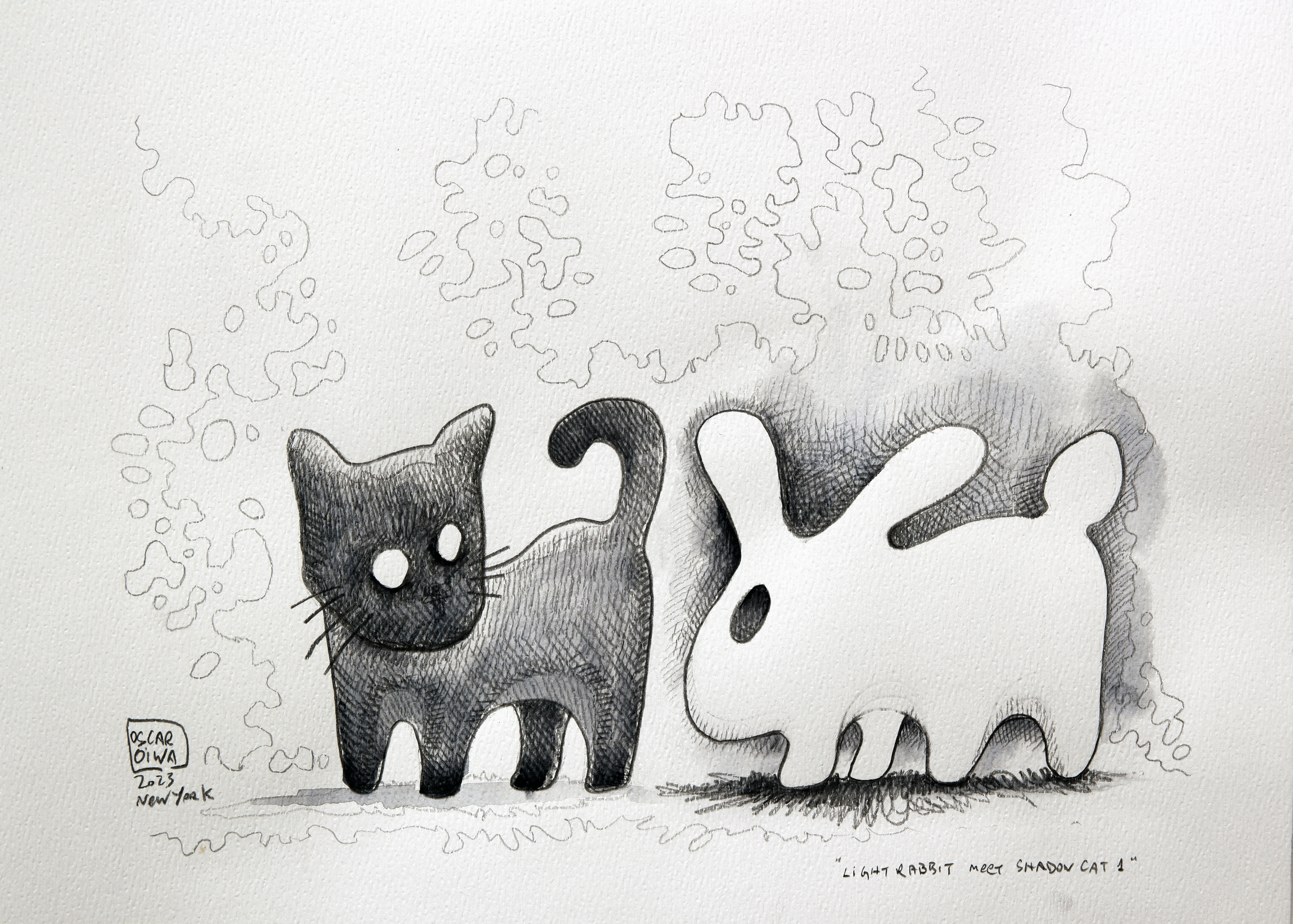 今回のアートフェアでは、オスカールの油彩画8点、隔離生活シリーズの版画を4点、最新作の「シャドウキャット」と「ライトラビット」のドローイングを4点出品する予定です。ドローイングのキャットは影、ウサギが光を表していて、光と闇のシンボルとしていつも描いているモチーフです。このウサギのモチーフは、今年の2月に開催された、台湾ランタンフェスティバル(台北)の作品でも発表されました。台湾の今年の干支もウサギである事も影響して、大きなラビットのバルーンの様な立体をメインストリートの地下鉄の駅に設置。月や地球を思わせる抽象的な球体も一緒に浮かんでいるように展示し、メディアでも注目されました。
