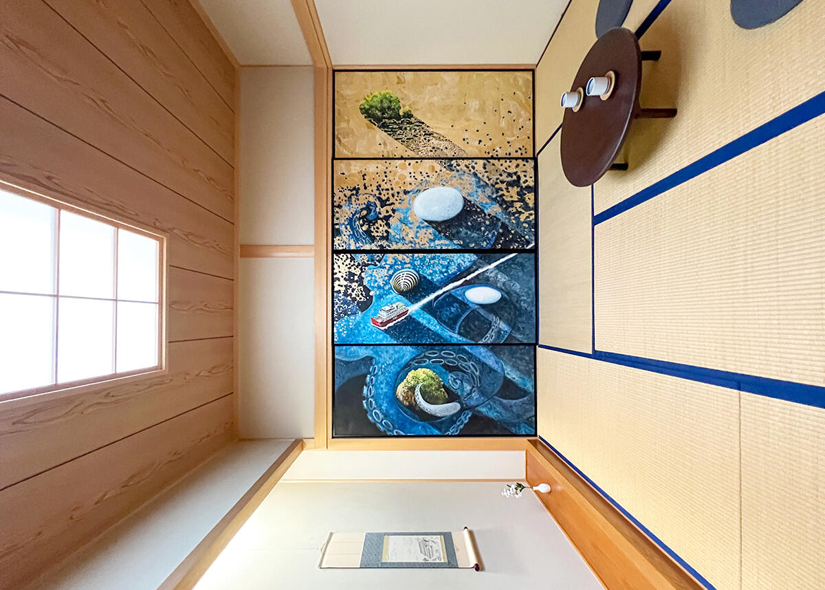 另一件參展作品是《Giant Octopus 2/巨型章魚2》。 這是在瀨戶內國際藝術祭在男木島上《The room inside of the room/房中房》的對應作品。畫中描繪了瀨戶內海的平靜水域中隱藏了一隻巨型章魚。這隻章魚象徵著潛伏在海面下隱藏的麻煩,與穿越平穩海面的小船形成了巨大的對比。 這件作品也是警告光明背後隱藏著黑暗的代表作品之一。