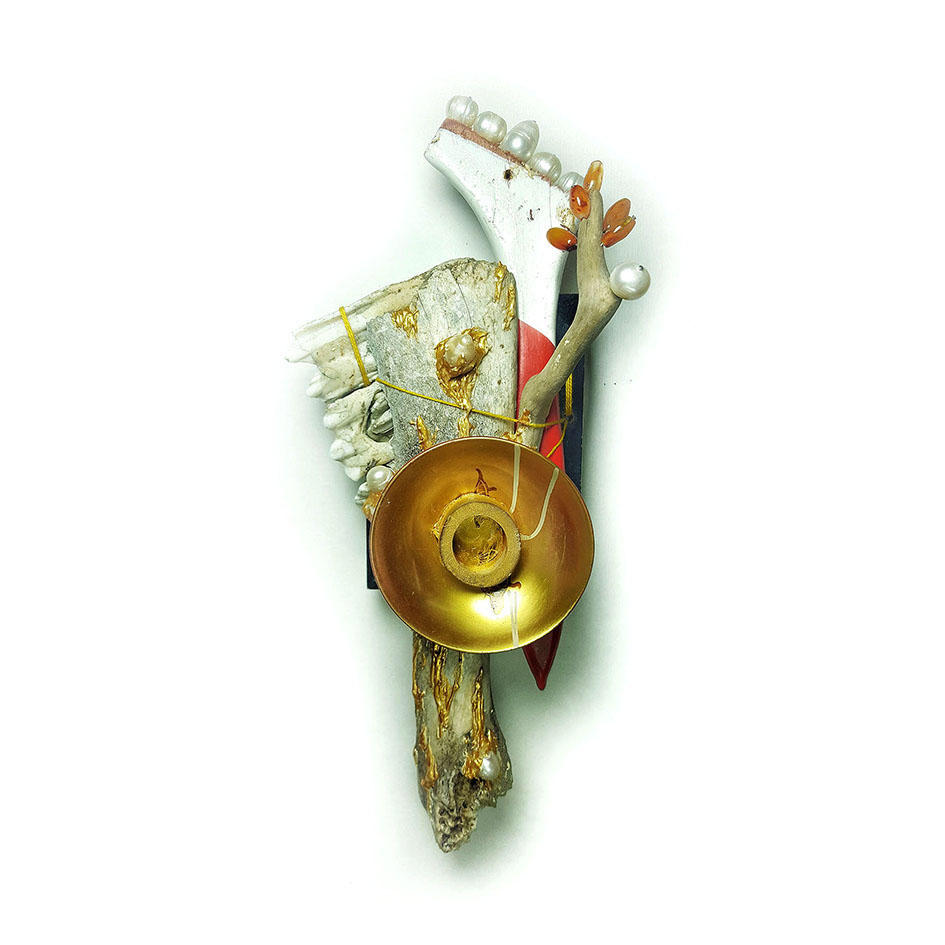 "Hybrid N°6" 2019 / 26.5cmx10.5cmx9.6cm / 黒い長方形のベース、トナカイの顎骨、真珠、盃、刷毛