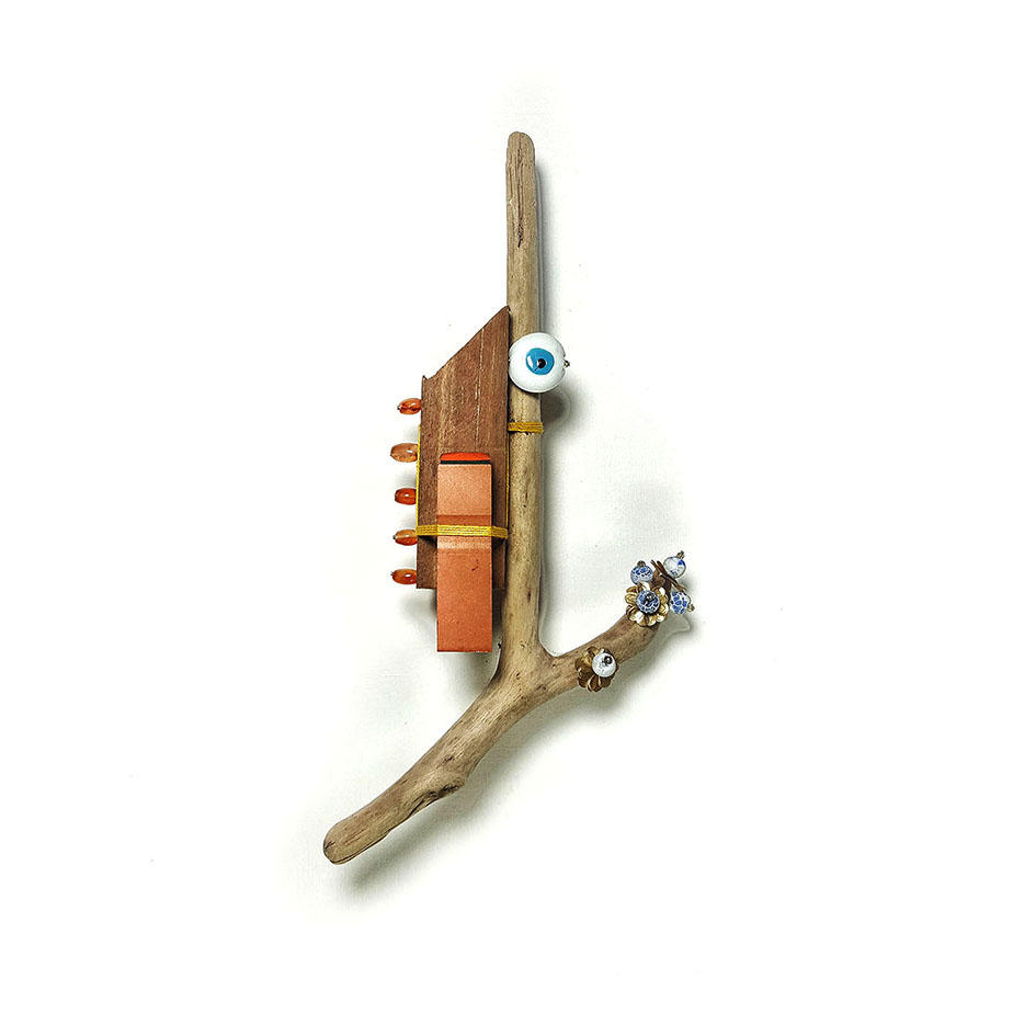 "Hybrid N°16" 2019 / 26.4cmx12.5cm.7.1cm / 流木、判子、木、カーネリアンビーズ、片目