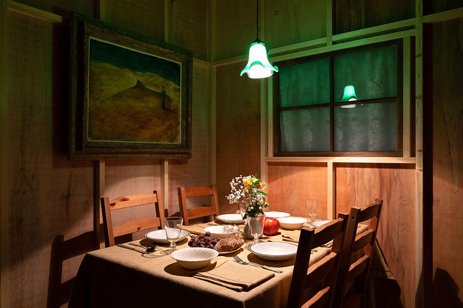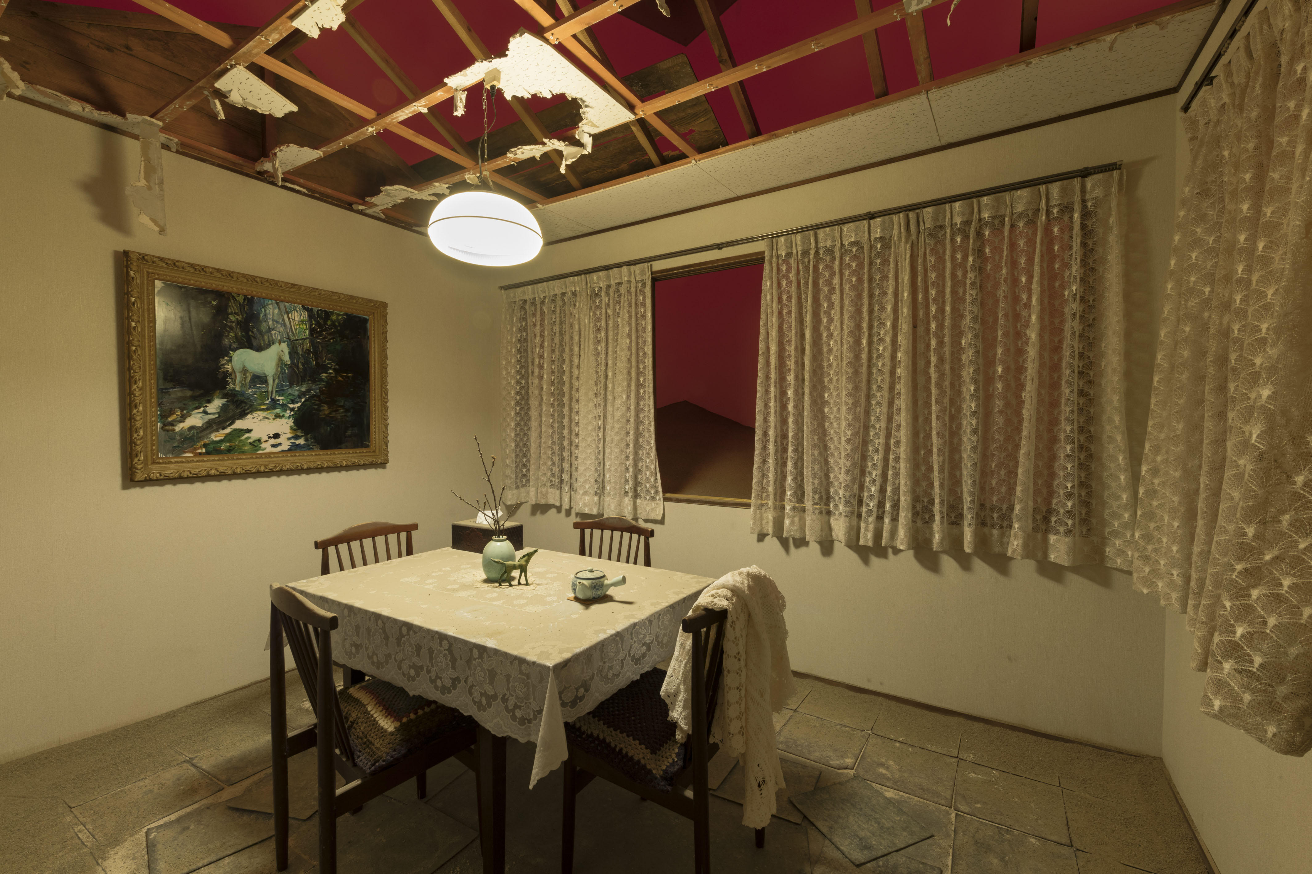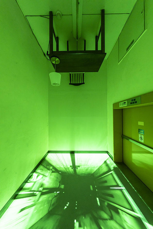 T: この作品は、つい先日まで市原市でいちはらアート×ミックスという地域芸術祭があったんですけれども、そこで発表していた作品で「下降」をテーマにしていた作品です。3フロアにわたっていて、フロアがそれぞれお互い関連しあっているような構造になっています。3階では映像が床に投射されていて、エレベーターのシャフトの中を撮影した映像なんですけれども、ひたすらループで下に下降していくように見える映像が流れています。この作品はもともと私が幼少期に見た夢をもとにして制作した作品で、その夢は緑色の細長い塔の中をひたすら自分が落下していくという夢だったんです。昔から高いところは苦手だったはずなんですけれども、そういった夢を小さいころ見ていて。私自身よく夢を見る人間で、それをしかも覚えているんですよね。さらに夢の中でわりと知覚するんです。例えば何か食べたら美味しいとか、音がしてたりとか、場合によっては「痛い」とか。実際には起きたときにはケガとかしていないんですが、(夢の中では)痛い気がして。、私はわりと自分の見た夢をモチーフにした作品をつくったりしています。中野さんにお聞きしたいと思っていたのは、そもそもなんで夢を見るんだろう。あと、何故夢を知覚したように感じるんだろう。すごく不思議だなあと思っていて。