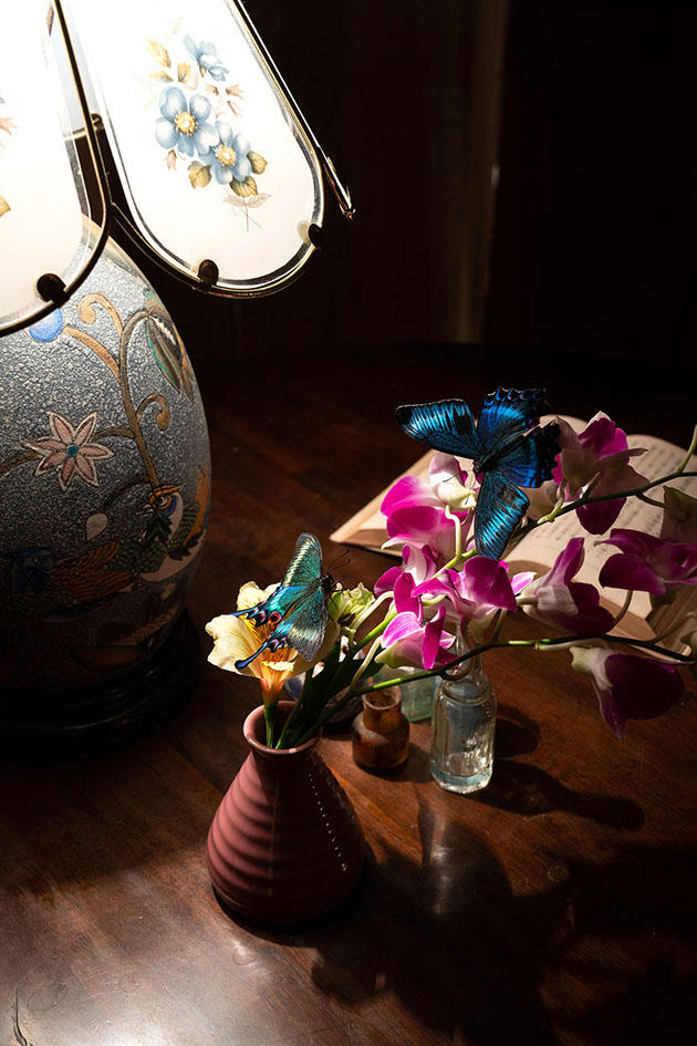 T:これ(Fig.6、Fig.7)は2019年にアートフロントで個展をしたときのものなんですが、いわゆる荘子の「胡蝶の夢」という説話のを題材にしています。「胡蝶の夢」を説明すると、荘子が寝ているときに自分自身が蝶になる夢を見た、蝶になってひらひら飛んでいたんだけれどもぱっと起きたら人間の自分に戻っていた、蝶の自分と人間の自分とどちらが本当の自分なのかわからない、というところから、夢の世界と現実の世界はどっちが上でどっちが下とかではなくて、等価な関係にあるのではないか、ということを語ったような話なんですね。この一連の話のことを「胡蝶の夢」という呼び方をするんですけれども、それをモチーフにして、こういう部屋のインスタレーションをつくりました。部屋の中に実は生きた蝶を羽化させてたくさん飛ばしていて、蝶って寿命が短いんですよね。二週間ぐらいしか生きないんですけれども、この展示自体1か月ぐらいあったので、中で飛んでいる蝶が次第に寿命尽きて死んでしまうこともありました。でもそれもそのまますごく綺麗な状態で展示していたので、生きている蝶と、いうなれば死んでしまった蝶が展示の中で共存していたんです。生きている蝶なのか死んでいる蝶なのかパッと見ただけではわからない、でも生きている蝶はたまに飛ぶんですよね、そこで急に飛ぶのでお客様はびっくりして(笑)。でもそういう生きている、生きていないの境目が分からない状態をこの展示ではつくっていて。で「胡蝶の夢」に繋げるならば、夢の世界と私たちが現実だと思っている世界の境目はどこにあるんだろう、生きているということと生きていないということの境目はどこにあるんだろう、もしかしたら境目はないかもしれないし、重なりあっているかもしれないし、さっき中野さんがおっしゃった、時間がもしかしたら逆行できるのかもしれない、というのと同じように、もしかしたら次元が層みたいに重なり合って、本来はどこかで繋がっているかもしれない。そういうような気持ちがあってつくった作品になります。