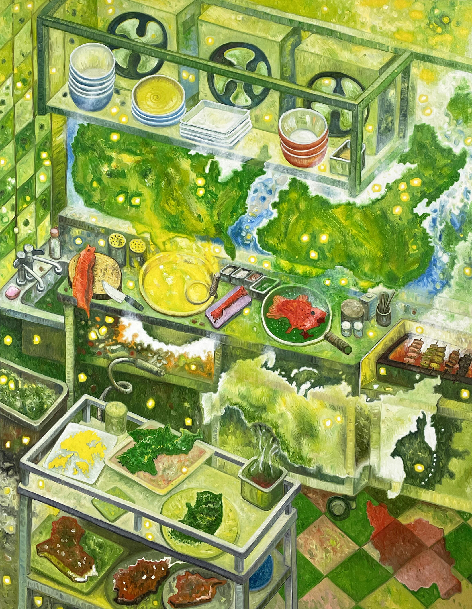 また、「Hells Kitchen 1」(2023)の名前の由来は、大岩の住んでいるニューヨークにあるレストランが立ち並ぶ地域の名であり、かつては危険な場所でした。キッチンという日常的な家庭の風景の中で、生存をかけた戦争が起こっているような二面性を持つシリーズ作品のひとつです。このキッチンでは、食事の準備が政治的混乱の比喩として表され、プライベートな空間と世界の情勢の関連性を映し出しています。