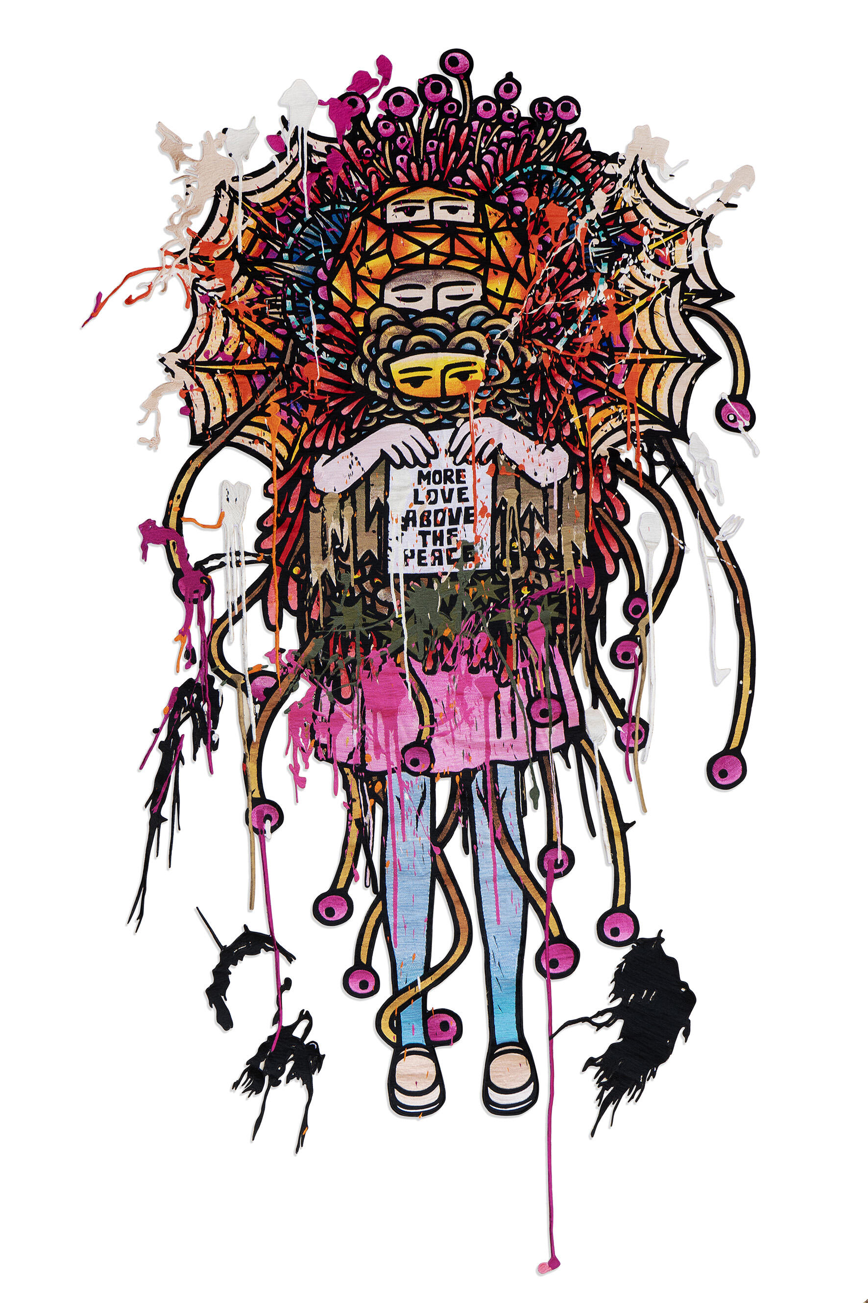 ヌグロホの作品は、1990年代後半の学生を中心とした運動の経験から、社会的なトピックを扱うものも多くあります。地域の伝統と都市環境に強い影響を受けながら、政治的主張に、ストリートアートやグラフィティ、漫画の要素の織り交ぜた新たな視覚言語を作り上げています。特に2024年に制作された「More Love Above the Peace」のシリーズは、現在、そして未来への平和のメッセージが表現されています。何よりも愛を大事にすることで、戦争の引き金となる憎しみや差別、自己中心的な権力などから、人々を救いたいという願いが込められた作品です。また、この作品はジョグジャカルタの昔ながらの刺繍技術が用いられていて、テクノロジーの発展により失われつつある技術を守ろうとする職人たちによって施されたものです。刺繍職人たちの刺繍や作品のプロセスへの思いもまた、ひとつの愛と言えます。ヌグロホは、愛こそがこの世の全てであり、地球を救う鍵になると考えています。