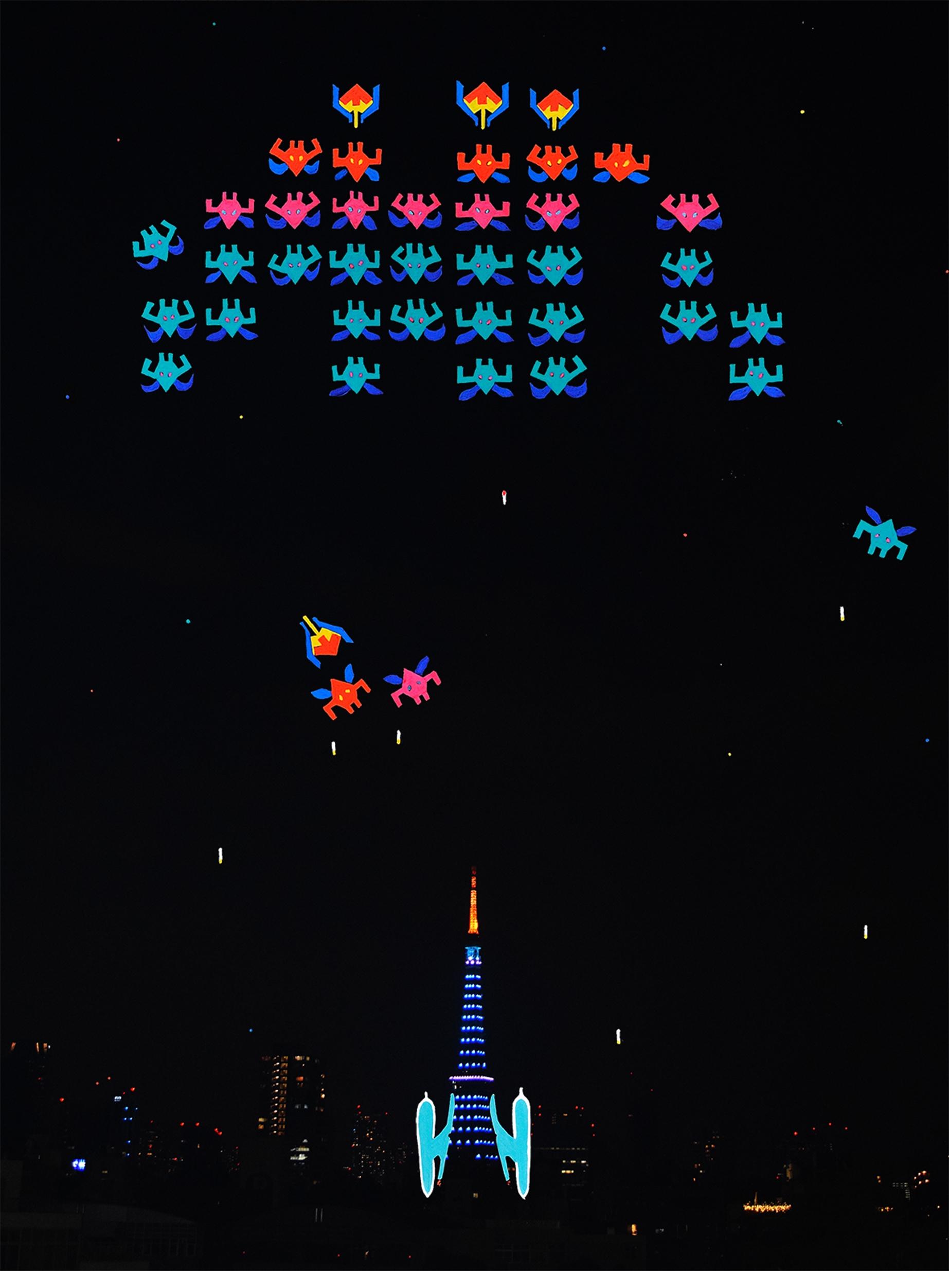 本作の青い光に包まれた東京タワーは、2020年のコロナ禍に医療従事者のための特別な照明パターンとして灯された時のものです。新型コロナは人類がおよそ100年ぶりに迎えた全世界共通の試練となりました。その未曾有の被害は作家にとってまるで未知の存在(インベーダー)からの侵略のように見えたといいます。緊急事態宣言下の東京で一人この作品を再現するために街に出た角は東京タワーが再び戦闘機に見えたといいます。この作品はポップな表層とは裏腹に当時の医療従事者と新型コロナの戦いをイメージしたものになりました。