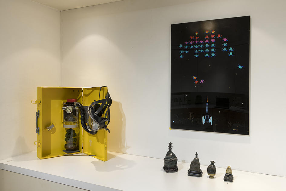 この作品はTVゲームの創世記に人気を博したインベーダーゲームがモチーフになっていますが、よくみてみるとその中心にある戦闘機はなんと東京タワーです。この作品は第一号を2006年に作っていますが、その時はインベーダーゲームの戦闘機が東京タワーに似ているという事で作った物でした。