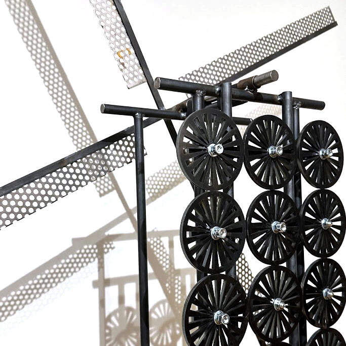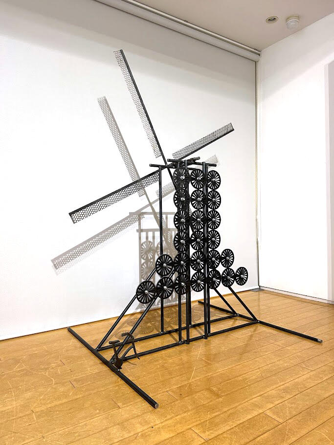 そして、現在アートフロントギャラリーでご覧いただけるのは、落山風藝術季出品作品の模型です。模型の段階から既にダイナミックな力強さが感じられ、また風車の軽やかさと、武骨に整列した鉄製車輪のバランスが魅力的な作品です。