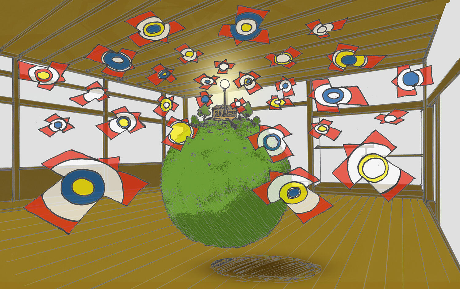 上総地方には、生まれた子どもの健康を願い、端午の節句に凧を贈る風習がある。「空高く舞い上がる姿に子どもの未来を重ね合わせたのだろう。けれど凧が自由に力強く見えるのは、糸の先にいつでも帰って来られる安心な場所があるためだとも思う」と角は語る。作家はこの地域の子どもたちの拠り所であっただろう古い木造校舎の中に惑星と凧のインスタレーションを創造する。思い出の地を目指して大小の袖凧が集まってくる。