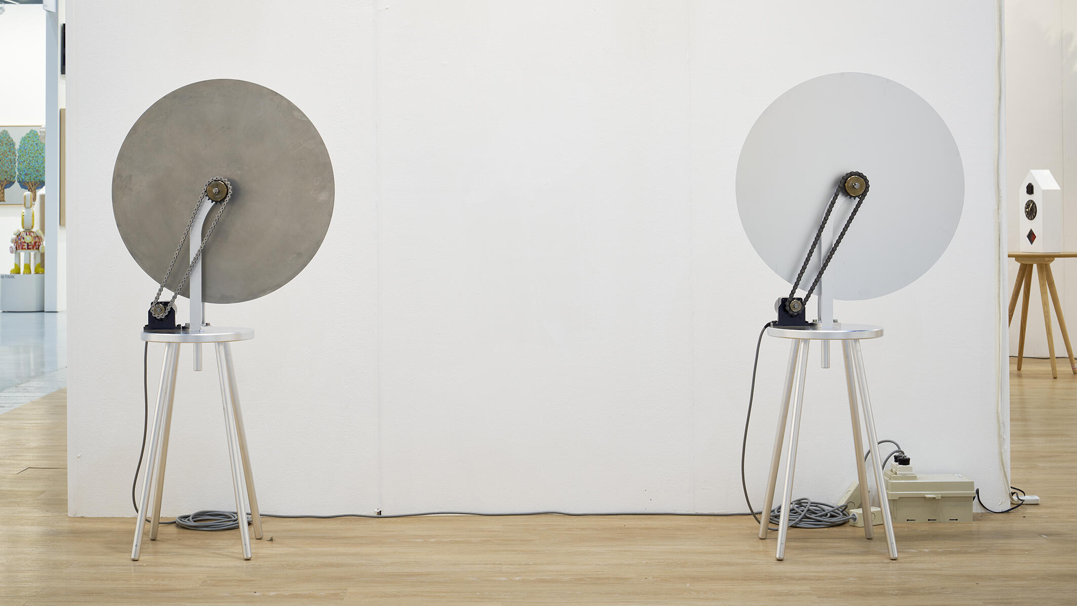 そして、ここで紹介しているのは東が2023年に制作した作品《machinery duchamp》です。これは、現代美術の先駆けともされるマルセル・デュシャン / Marcel Duchamp(1887 - 1968)の最初のレディ・メイド作品《自転車の車輪 / Bicycle Wheel》(1913)からインスピレーションを受け制作された作品です。100年以上の時を経てシンプルな円盤形態となった車輪がオートマチックに回転する様子は、現代社会にどんなメッセージを伝えているのでしょうか?本作は、これまでの人力で動く大型自転車作品とはまた一味違った新たな試みが垣間見れる作品です。