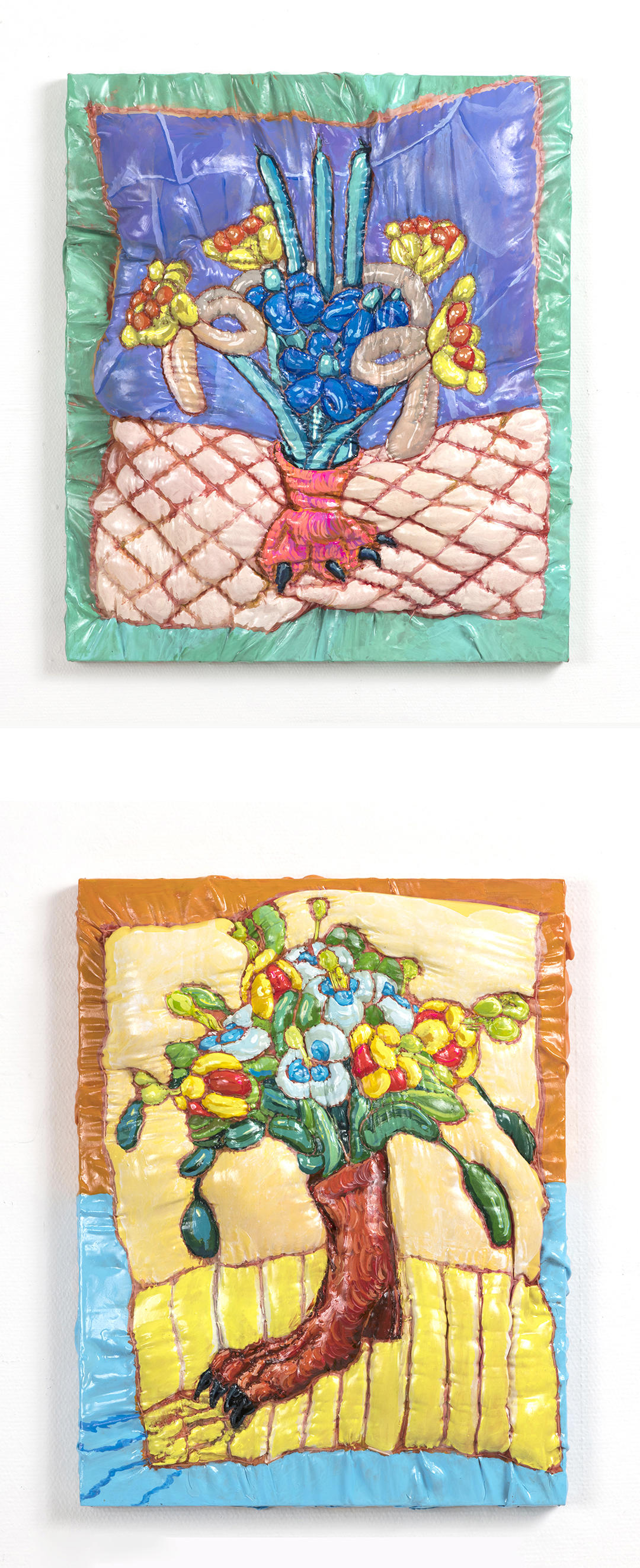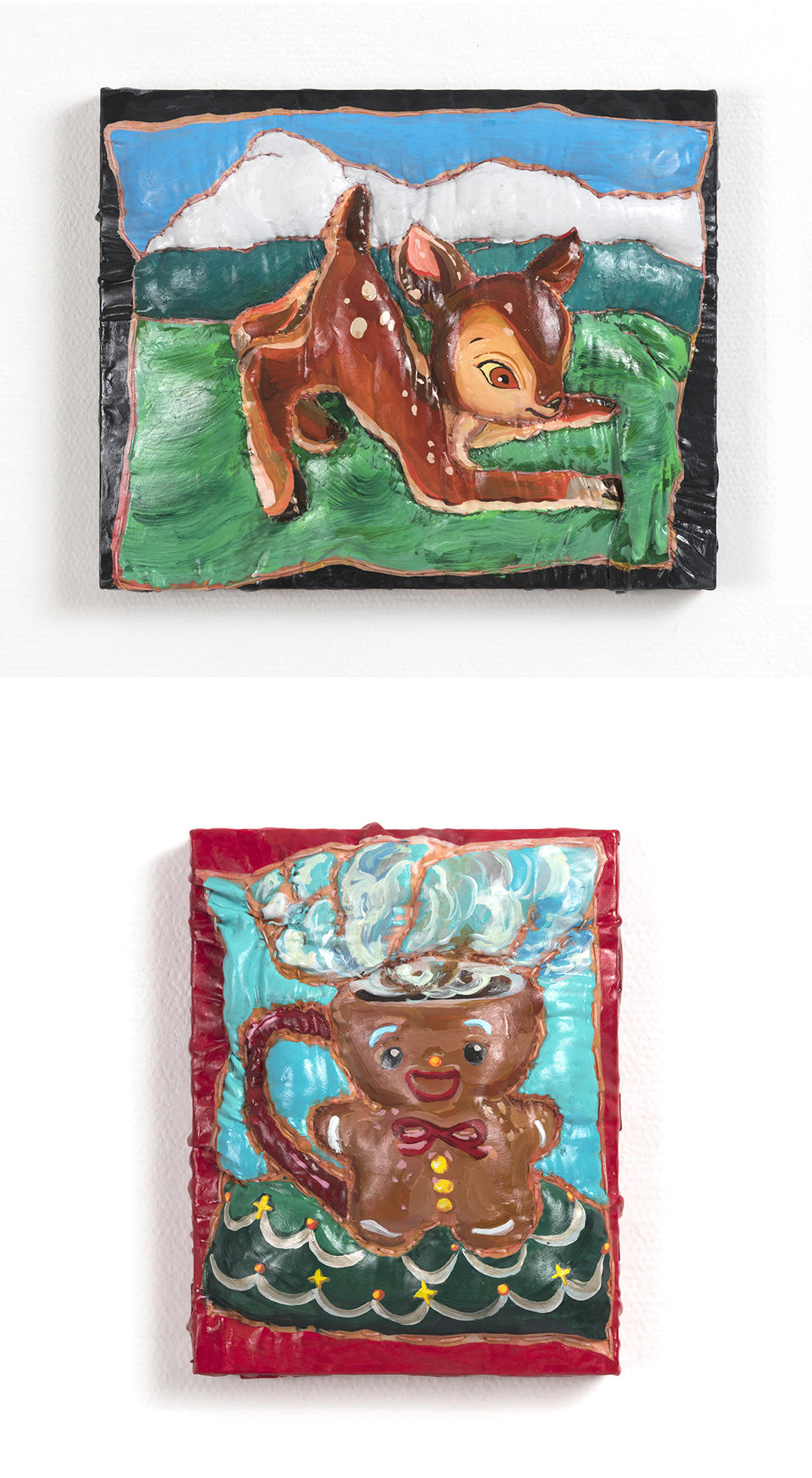 そして、現在アートフロントギャラリーにてご覧いただける作品は、今年の春に新たに制作したシルクの布を使った小作品です。(以下写真参照)日常生活の断片を、刺繍とペインティングの組み合わせで表現した本作品群は、内部に綿が詰められ凹凸のあるカタチがとても特徴的です。空間を明るくする鮮やかな色彩と、そこに描かれる日常に存在する生命感—。青山特融の世界観をどうぞお楽しみください。