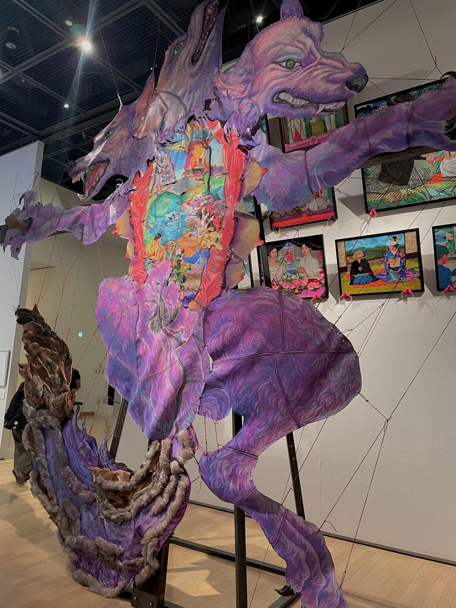制限され生きづらさを抱える中で、境界なく入り混じりつながる獣に強い可能性を感じ、様々な動物の皮膚を結合させ、破壊と治癒の循環を死者の行方を見守る番犬の背中に描いたという本作は、裏側に2億5千年後の地図が合皮を中心に縫い合わされており、ケルベロスの表皮となっている。表側は幻獣の内面となり、青山がリサーチしてきた山形の表象たちが描かれている。