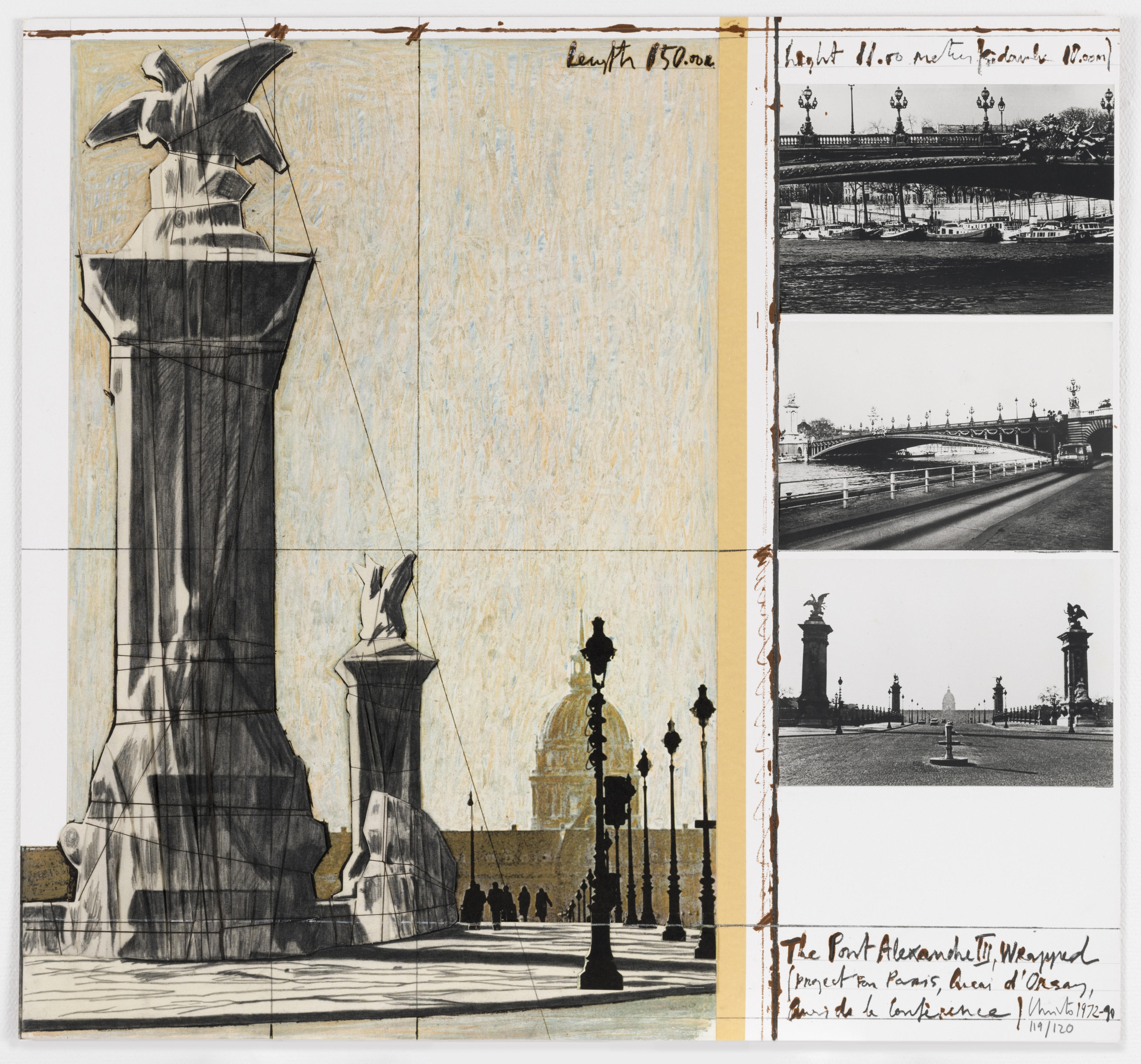 クリスト《梱包されたアレクサンドルIII世橋、1972-1990》edition 120, リトグラフにハンドコラージュ, 1991, h70 x w75cm