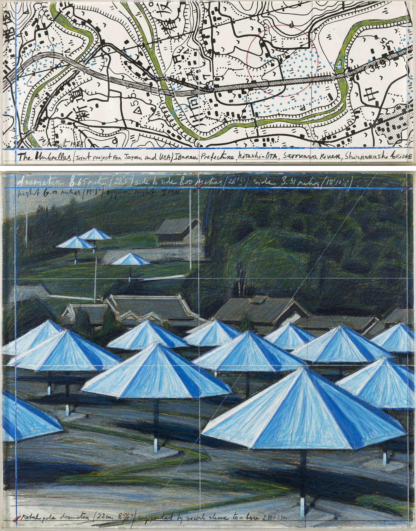 クリスト《アンブレラ、日本とアメリカ合衆国のためのジョイント・プロジェクト1984-1991》1988, 鉛筆、布、パステル、木炭、クレヨン、エナメルペイント、地図