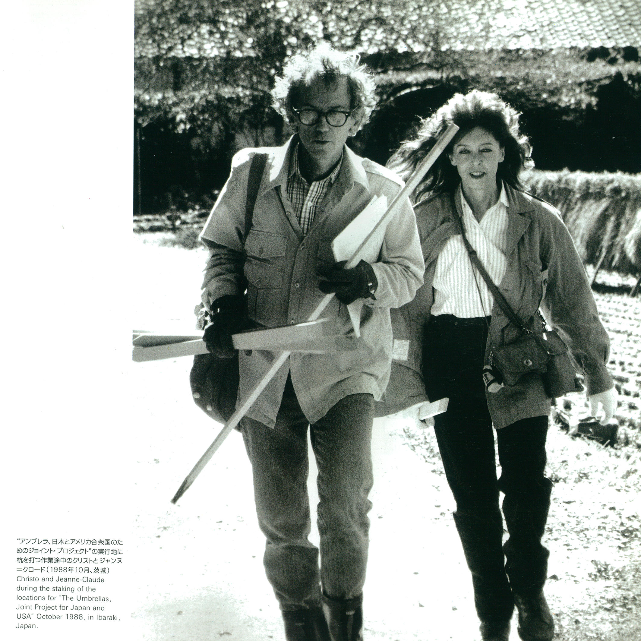 アートフロントギャラリーとのご縁は、1991年に日本の茨城とカリフォルニアで行われたプロジェクト・アンブレラの開催をサポートしたことに始まります。写真のドローイング作品でも描かれている《アンブレラ、日本、アメリカ合衆国、1984-1991》は日本の茨城とアメリカのカリフォルニアの2地点を拠点に同時開催したプロジェクトで、傘の設置によってそれぞれの谷の地形的な共通点と差異を浮き彫りにしました。しっかりと固定されたスチールの台座に垂直に立てられた傘は茨城で1340本、カリフォルニアで1760本。茨城においては459か所の個人主や公的な場所にわたって傘が設置されており、プロジェクトに対する地域の協力と理解が伺えます。