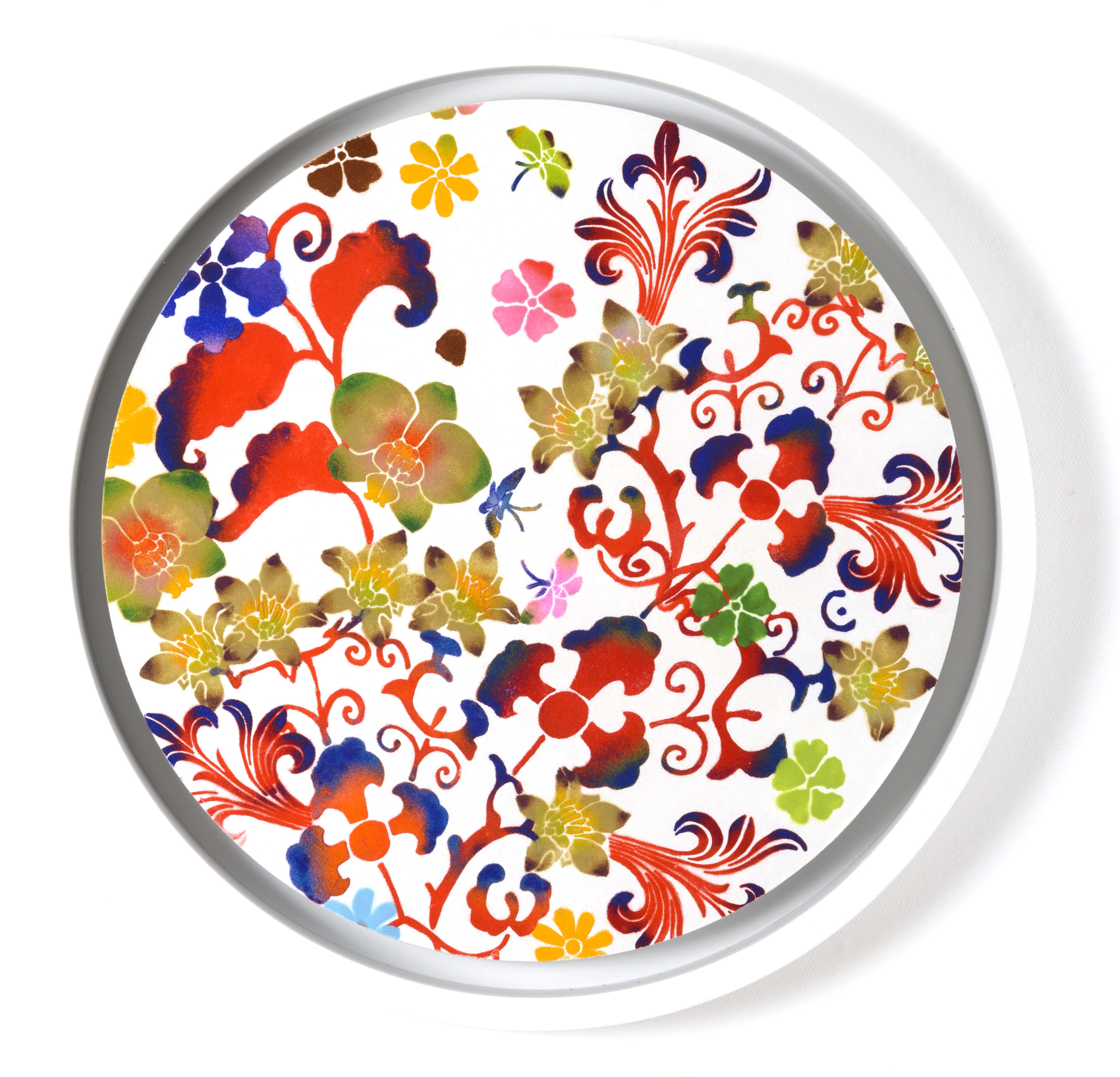 本作は、植物紋様を円形のフォーマットの中に描いたもので、2013年台北での個展で発表されました。Tree of Life と題された同展では、桜の木のシルエットが床から壁面いっぱいに描かれ、その上にこのようなカラフルな円形の花がいくつも配されていたといいます。描かれた花のモチーフは台湾の伝統的な織物などにヒントを得た植物紋様で、円形の中に軽やかに収められ、近寄ると顔料のエッジの美しさが目に飛び込んできます。