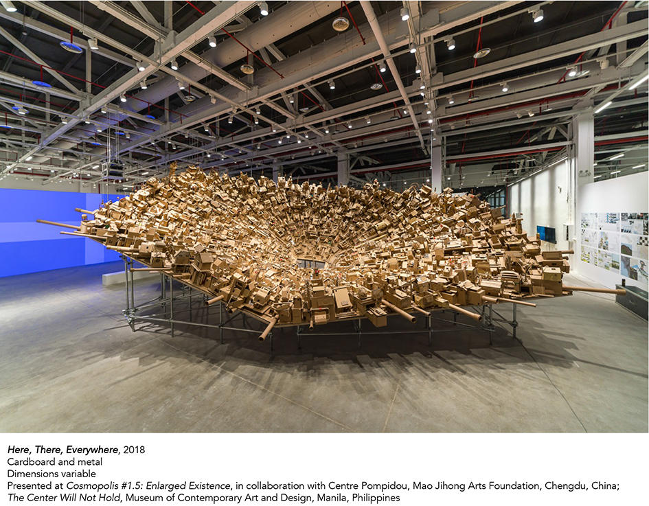 「昨年中国の成都でやった展覧会。ダンボールを使って大きな都市、コスモポリスを表現。パリのポンピドーセンターが企画に関わった。ダンボールという素材を使うことで、「移動」というメタファーがこめられている。」