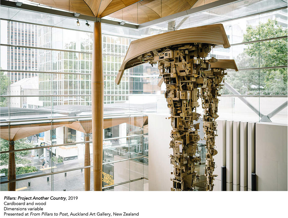 「我々がいつも最初にやることは、まず街のリサーチをして、その場所で何ができるかを考える。こういう方法はどの場所でもあてはまるが、今年ニュージーランドのオークランドで発表した作品は、街中にあふれているホームレスの人々をフィーチャーしたものだ。彼等はいろいろなところから移住してくるが、住む家がないのでダンボールの家に住んでいる。そんな姿を表現するため、美術館の一室を開放して人々にダンボールの家をつくってもらい、それを構成して船による「屋根」をとりつけた作品で、約1年のプロセスだった。」
