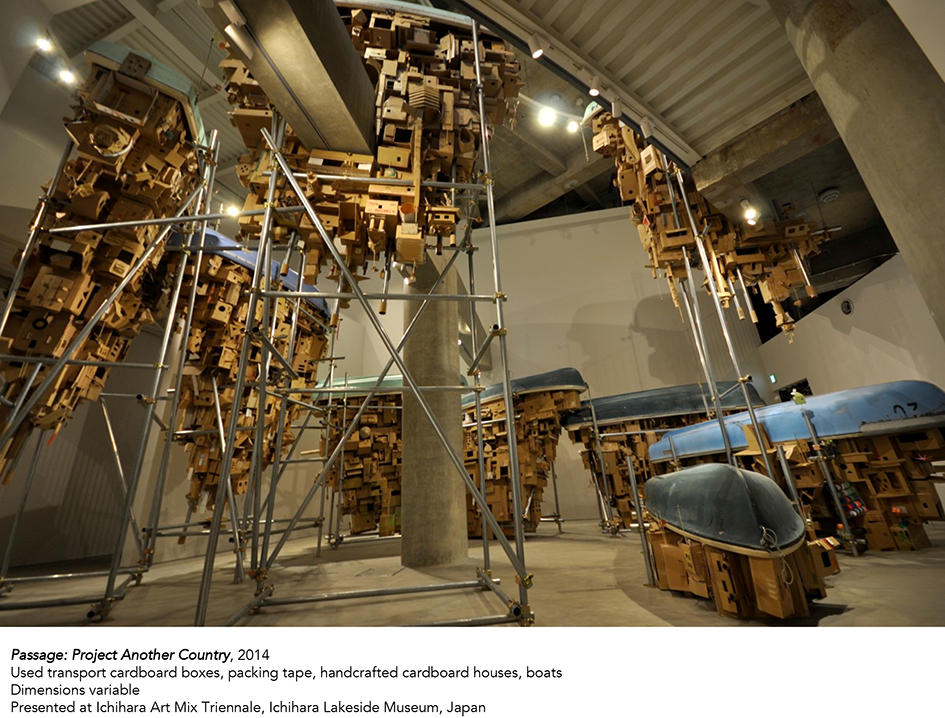 実際、人やモノの移動に注目してきたアキリザンのProject Another Country はこの10年以上にわたって展開している重要なシリーズだ。最初に手がけたのは2006年、7人家族のアキリザンがフィリピンからオーストラリアのブリスベーンに移住した年である。移住にも使われたダンボールのインスタレーションを通して、アキリザンは様々なコミュニティと繋がってその地域にしか成り立ち得ない作品を作り出している。