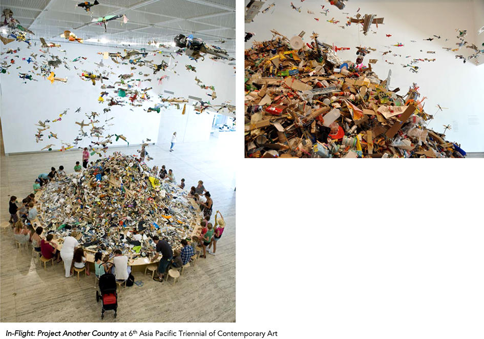 「これはブリスベーンに移り住んで数年たった2010年にアジアパシフィックトリエンナーレに招待されてつくったもの。地域の人々に自分たちのものをもってきてもらうというのが参加型の方法でそれらを一つのものに組み上げられることを実現したかった。お互いに手を動かす協働の中で関係性をつくりあげていくことが示せたと思う。」