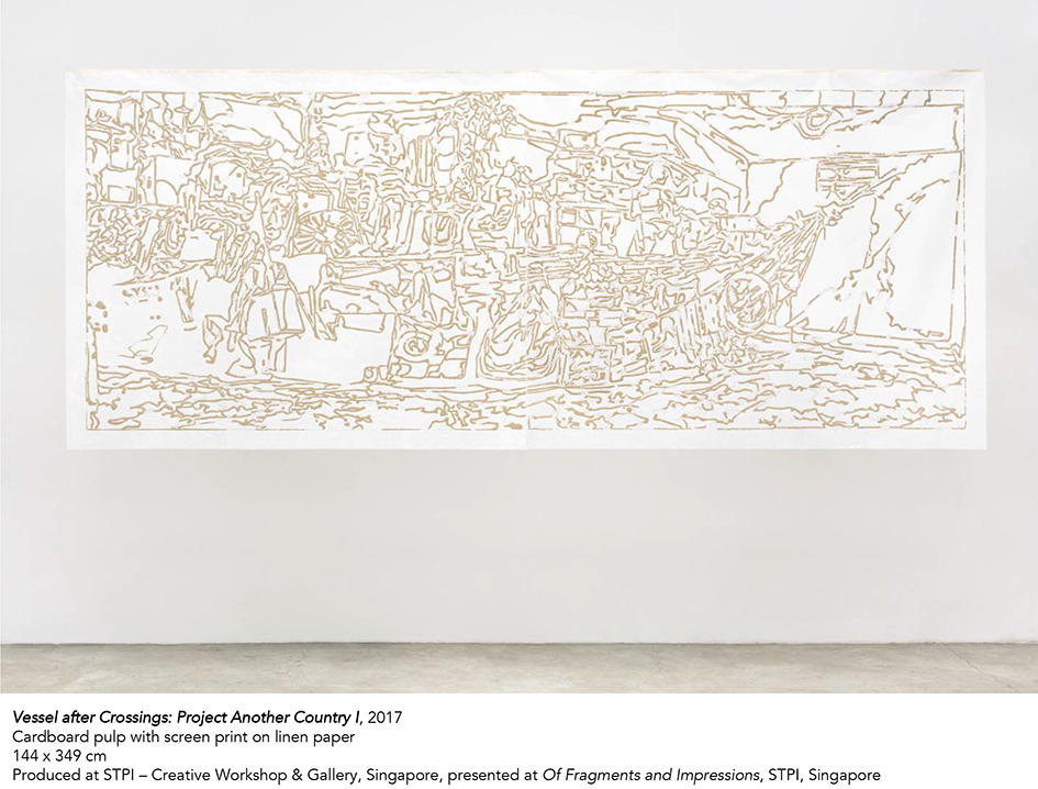 「こちらの作品では、ダンボールになる前のパルプの状態を使ってスクリーンプリントを制作した。これが実現できたのは、シンガポールのSTPIという世界中のアーティストを招待するレジデンスプログラムをもっているスタジオの、技術者たちのおかげだ。中でも、日本の技術者たちがとても有能で協力的だったのを覚えている。素材が本来持っている姿(ダンボール)とそれがどのように形を変えうるか(プリント)に興味をもっていて、ダンボールをプレスしてそれを版として製作した作品がこれだ。」