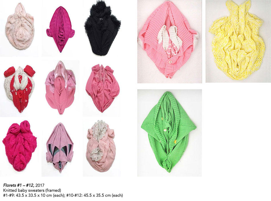 確かに妻有の人々が離れて暮らすこどもに寄せる想いは、国境を超えて共有されるべきものだったかもしれない。事実、アルフレドは自身が留学して海外にいるときに、家族を思って「小さな花」シリーズという作品をつくったことがある。小さな花の意であるfloret は赤ちゃん用のニットセーターを折りたたんで女性の性器をかたどった作品である。これらのデリケートな作品はアルフレドが海外にいて妻や5人のこどもたち、特に生まれたばかりの娘を恋しがって制作したもの。実際には会えない家族との距離を、古着屋で30日間赤ちゃん用のセーターを買い続けることで魔法のように縮めてみせた。