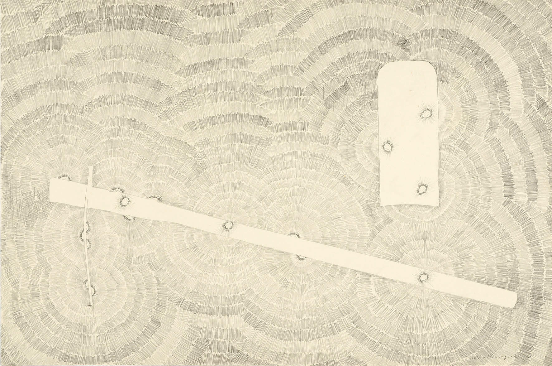 「関係—種子・農具(ドローイング)」は立体作品「関係—種子・農具」を紙に置き、その種子からたちのぼる生命の「気」を描いた鉛筆によるドローイング連作。