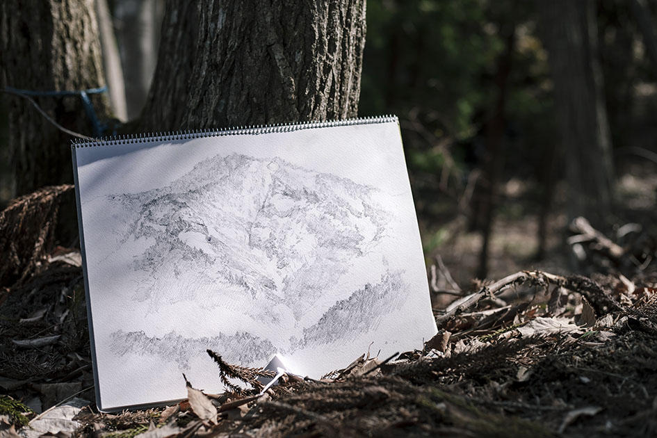 「冩生(しゃせい)」をベースとし、自身を取り巻く環境をモチーフにした絵画制作を続ける春原直人の原体験は故郷である信州の山々にあるのでしょう。当たり前のものとして差し出されている時にはけっして気づけない、現在との時差によって手に入れたあの頃の心象風景と、山形の実景が複雑なレイヤー構造として絡まり合い、彼の息遣いと二重写しになることによって抽象度の高い「山そのもの」としての絵画が生み出されます。