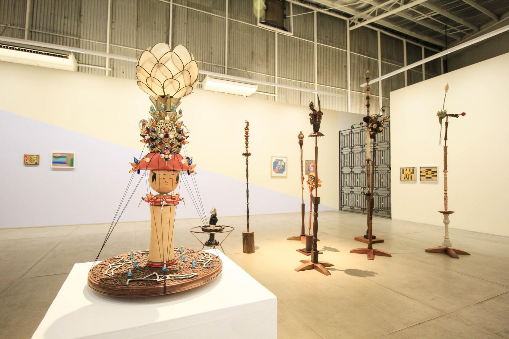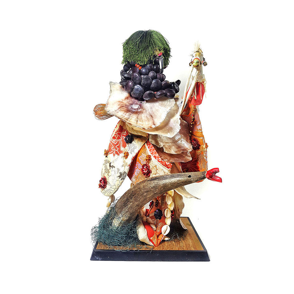 (今回展示されている日本人形を模した作品にも、スパンコールのように貝殻が花型ビーズが縫い付けられ、文化のルーツが複数あることが感じ取れます。)