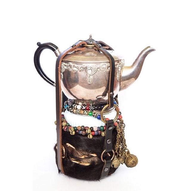 2013 / 銀メッキのティーポット、ボーンチャイナの皿、動物の革製のドラム、ガラス、青銅のビーズのネックレス、革、金具
