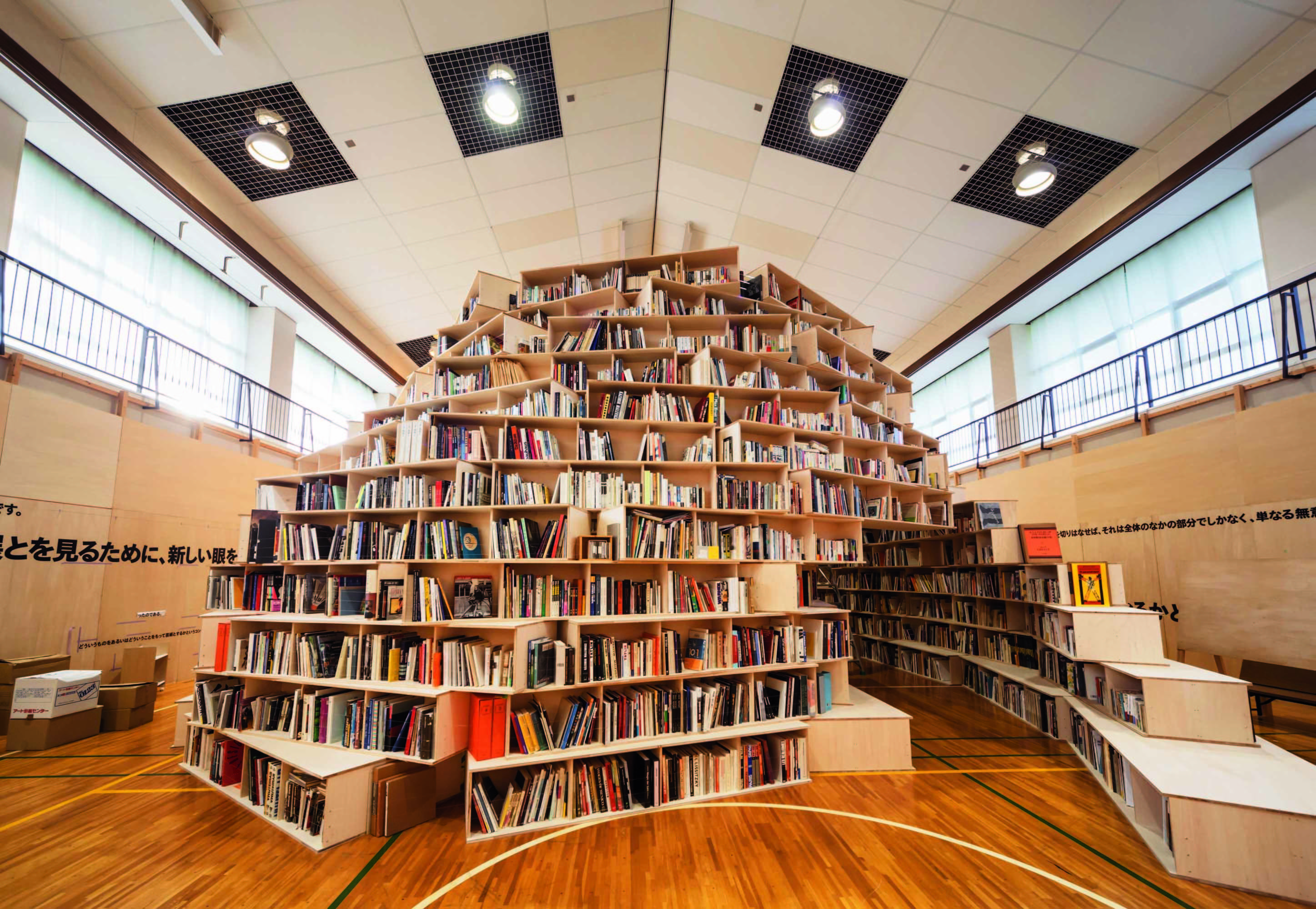アートフロントギャラリーでは1980年代、川俣がインスタレーション作品を手掛けたときからお付き合いを続けています。妻有ではこちらも廃校を使ったインスタレーションを発表しましたが、小学校全体が作品のアーカイブとしても機能し、ただ見るだけではない展示の可能性を模索しました。山型に積み上げられた本は、2000年の妻有トリエンナーレを美術評論家として新たな芸術の在り方とサポートした故・中原佑介氏の寄贈図書なども含まれています。