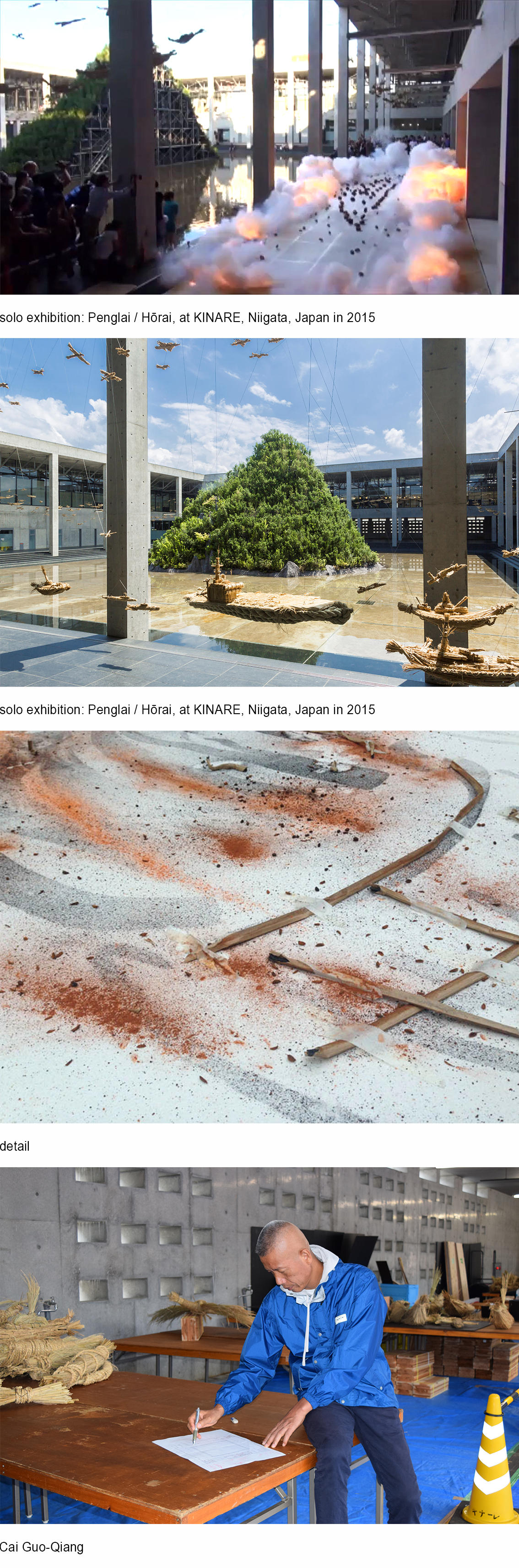 蔡國強は妻有トリエンナーレにアーティストとしてだけでなく、ドラゴン美術館のキュレーターとしても参加してきました。2015年には中国の神仙思想に基づいた蓬莱山をキナーレの池の真ん中に創り出し、トリエンナーレのオープニングでは、そのすぐ横で火薬を爆発させたいわゆるガンパウダードローイングを制作、すぐに東京のギャラリーに運んで展覧会をオープンさせました。ドローイングのモチーフとして、地元の子供たちが描いた海の生き物などが使われており、現在でもこれらのドローイングが人気を集めています。
