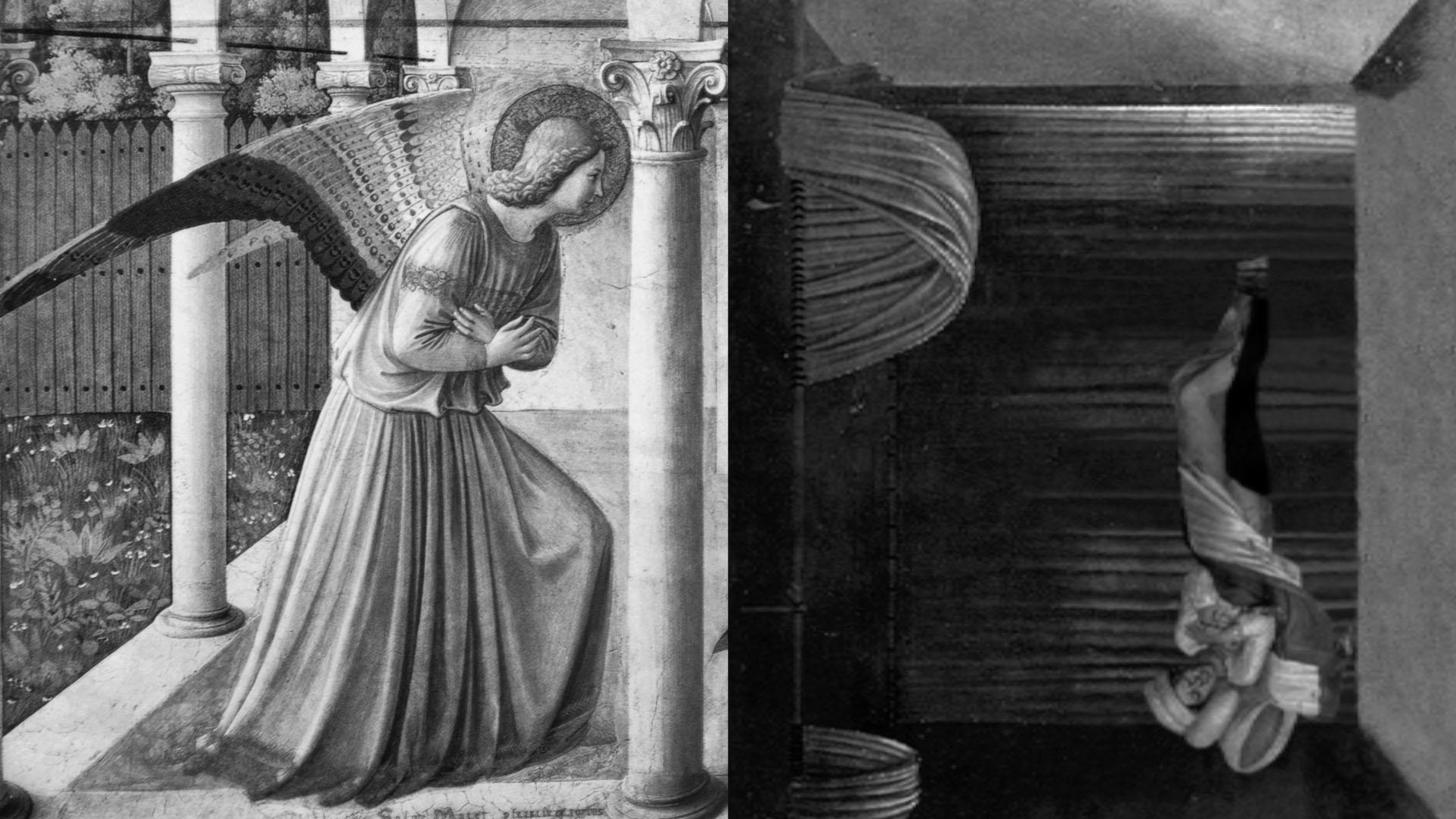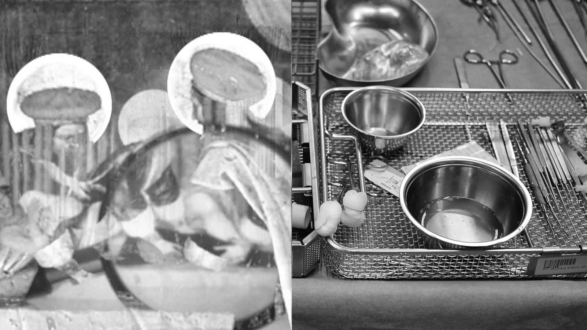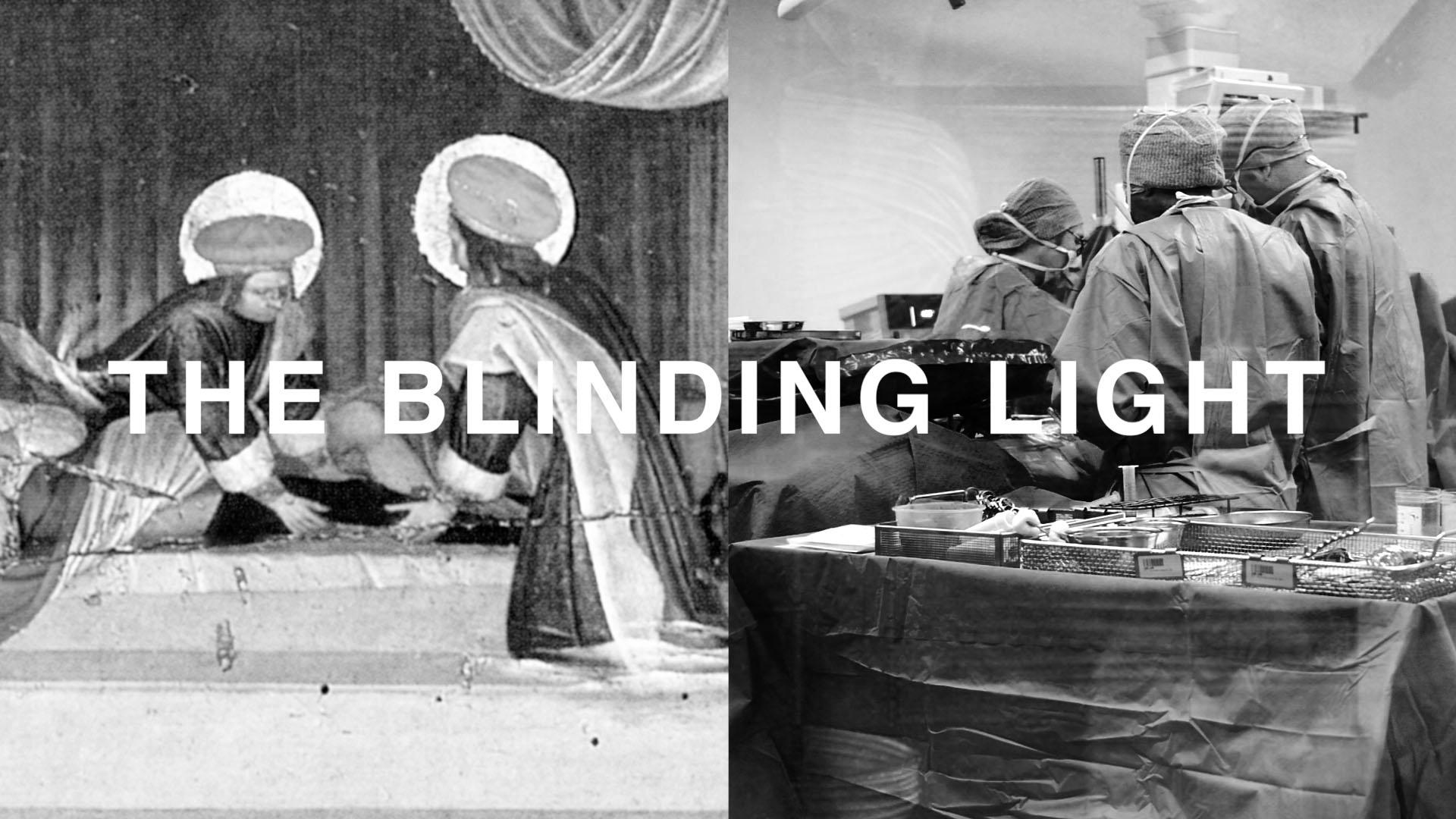 The Blinding Light の最初のフォトモンタージュ(2013)のシリーズでは、医療機器一式や衛星用具を備えた手術室を様々な角度から撮り、その写真群を「奇跡の絵画」に重ね合わせている。同タイトルのビデオにおいて医師は二人の聖人の傍らに立ち、彼らは全体として一つの作業グループを成している。こうして亡霊と生きた人々とがもう一つの現実、すなわち一時的な空想の世界に共存し得るが、それは宗教上のテキストと同じぐらい奇跡的な現象となっている。The Blinding Light ビデオ2014年版では、現代の手術風景とフラ・アンジェリコの作品がさらなる重層的な展開を見せており、ルネッサンス時代と超現代との連想とが単なる交配以上の効果を生み出している。異なる時代と空間を重ねるという一時的な省略方法は、これまでは聖なる奇跡と思われていたテクノロジーや麻酔の領域にまでその力を及ぼし、画面に描かれた人物は亡霊として提示される。重層的なレイヤーを眼にした観者は、否応なくルネッサンス期と現代を心理的に往来するだろう。宗教上の奇跡は現代においても実現可能であるというコンセプトは、まさにこの異なる時代を重ね合わせることから生まれるのだ。