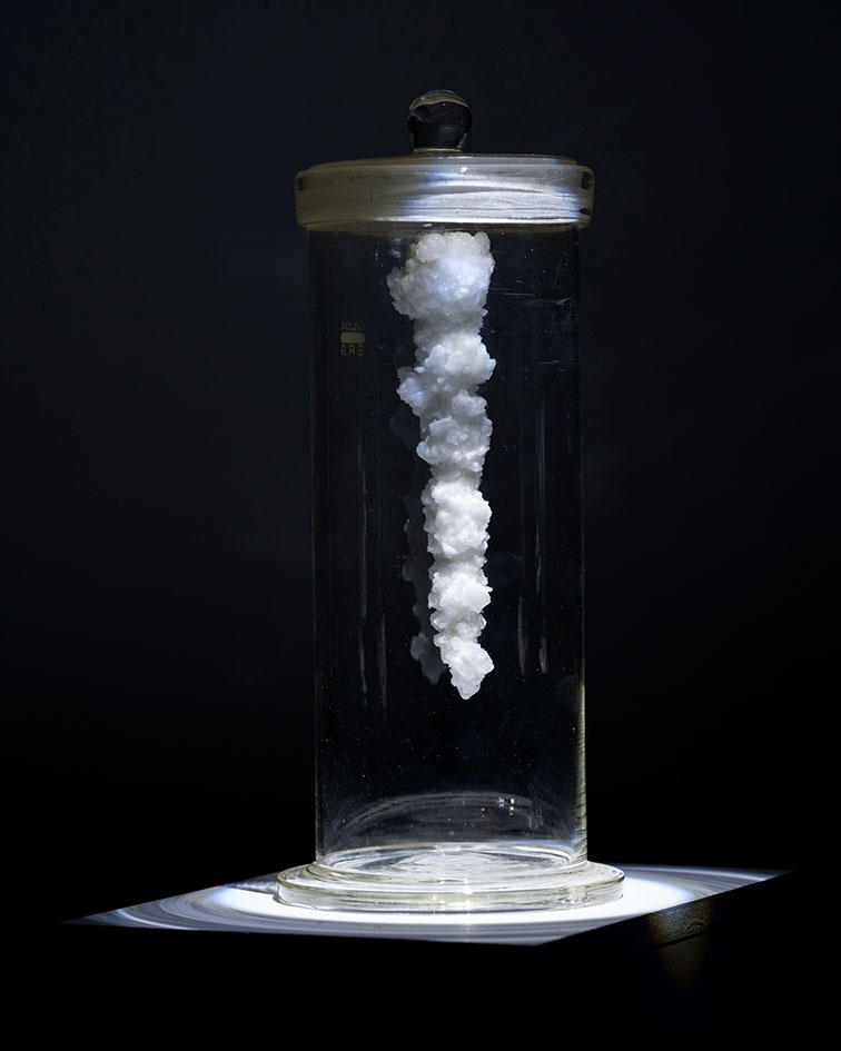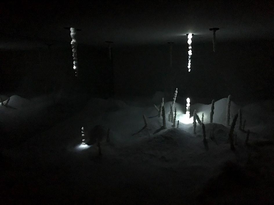 N:それから透明の記憶の蓄積みたいなもので時間が積み上げられていくものを形にできないかと考えました。まず、食塩をつらら状にして上からじわりじわりと溶け出していく様子。塩水や水が溶け出して、つくられていく時間をつららで表現しました。そして、その先に今一滴垂れそうなものを、この瞬間で固定してしまおうと試みています。それに対して下の映像は動き続けるようになっています。その時間をどのように重ねていくかという問題を提起しています。