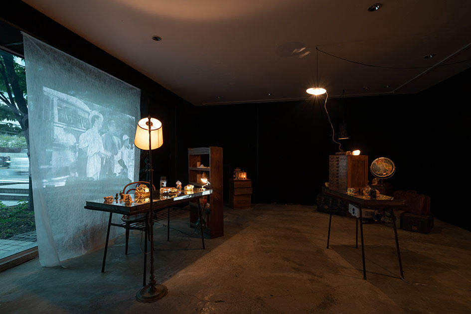 よく芸術祭などで人が10年20年住んでいない空き家にはいらせてもらうと、タンスや本棚が置いてあって、そこにおみやげものが埃をかぶって並んでいたりするんですよね。そういう状況、旅がそのままそこに定着して最後まで記憶として残っていく、そういうところに今回展示の方向を少し偏らせています。実は、搬入の初日に北新宿の空き家には入らせてもらって、そこからその机などを埃のかぶったまま頂いてきたんです(笑)。