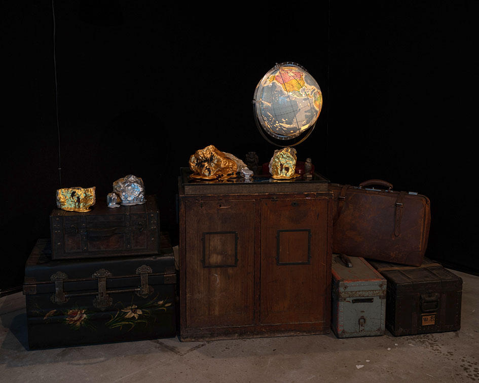 今回のインスタレーションが日本の旅というものが形づくられるルーツを示しているかと思います。金色のこれらの作品は単品でも販売していますし、インスタレーションとしても販売しています。