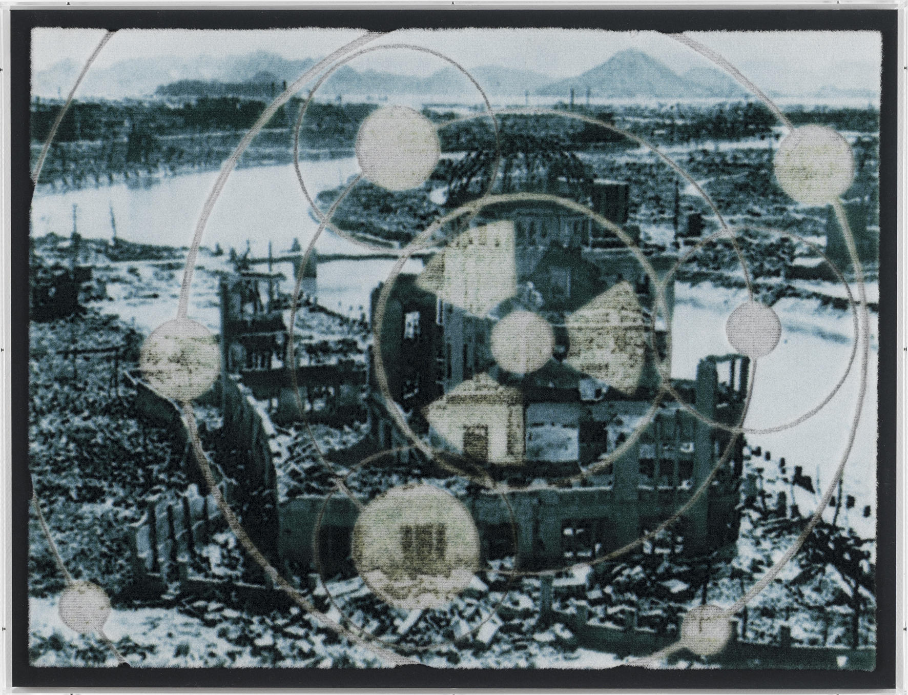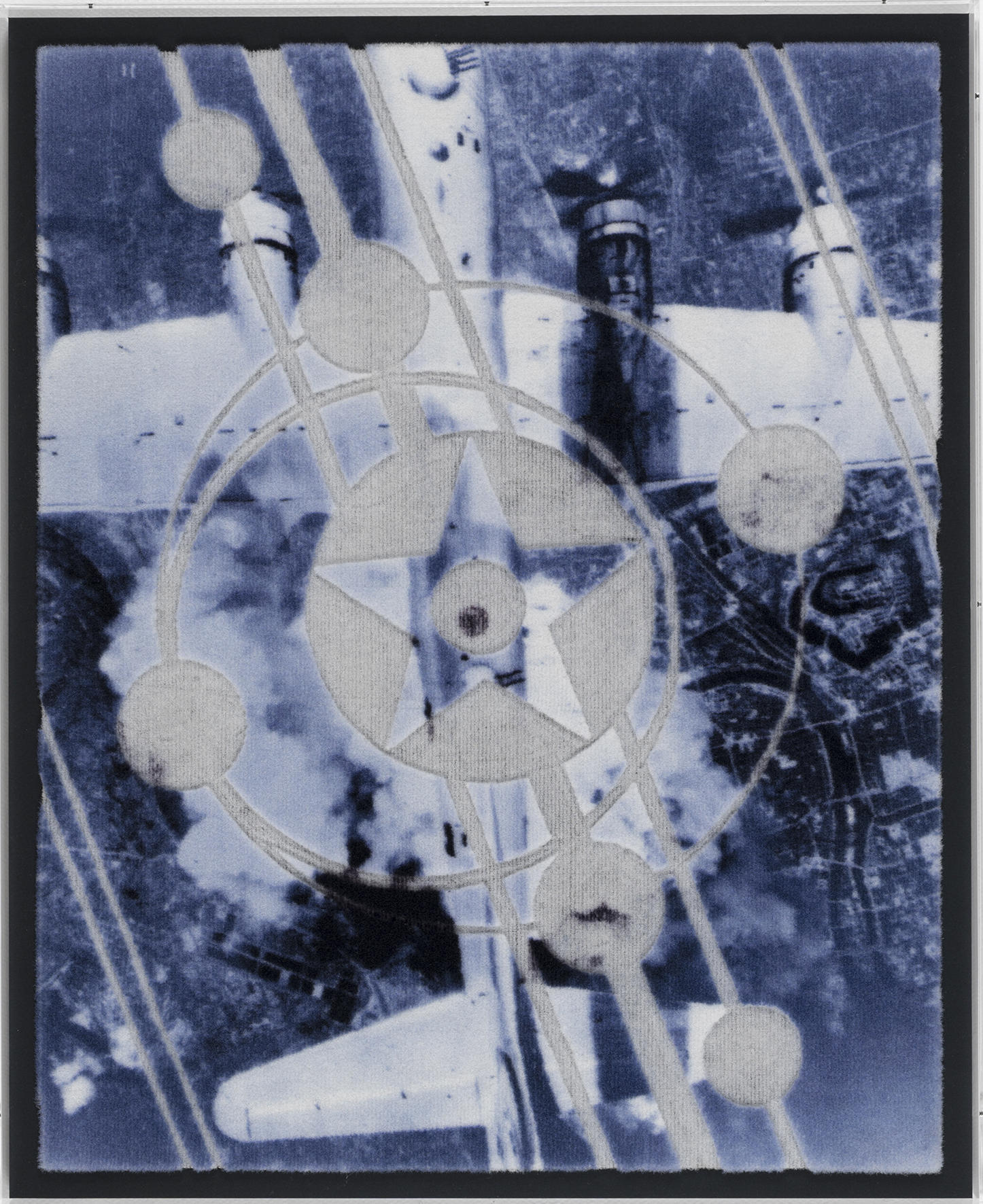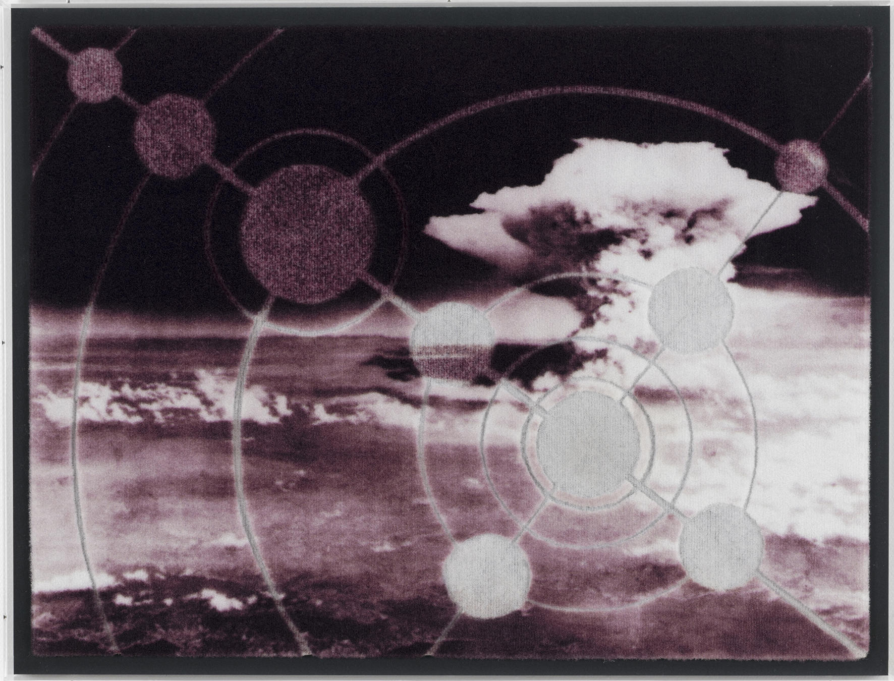 素材は絨毯にインクジェットで印刷して、その上を幾何学文様とかミステリー・サークルの様に表現しています。ミステリー・サークルは、クロップ・サークル (Crop circle)とイギリスでは言うみたいですけれども、刈り込むサークルなんです。それをちょっとモチーフに、写真に関連した模様、アメリカ空軍とか、放射能のマークなどを、バリカンで刈って模様をつけています。