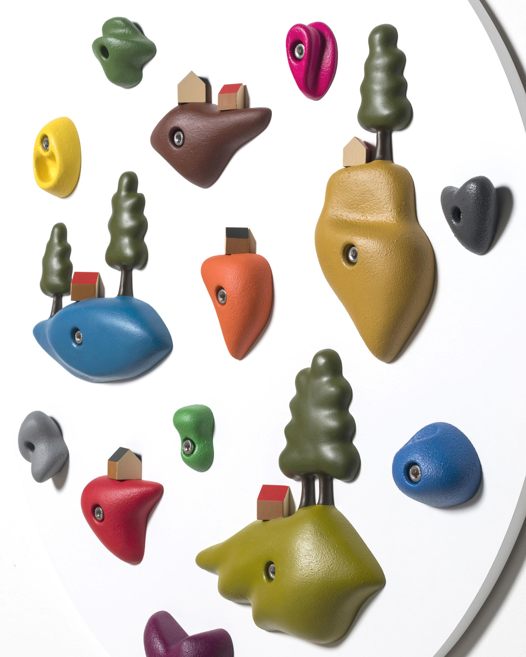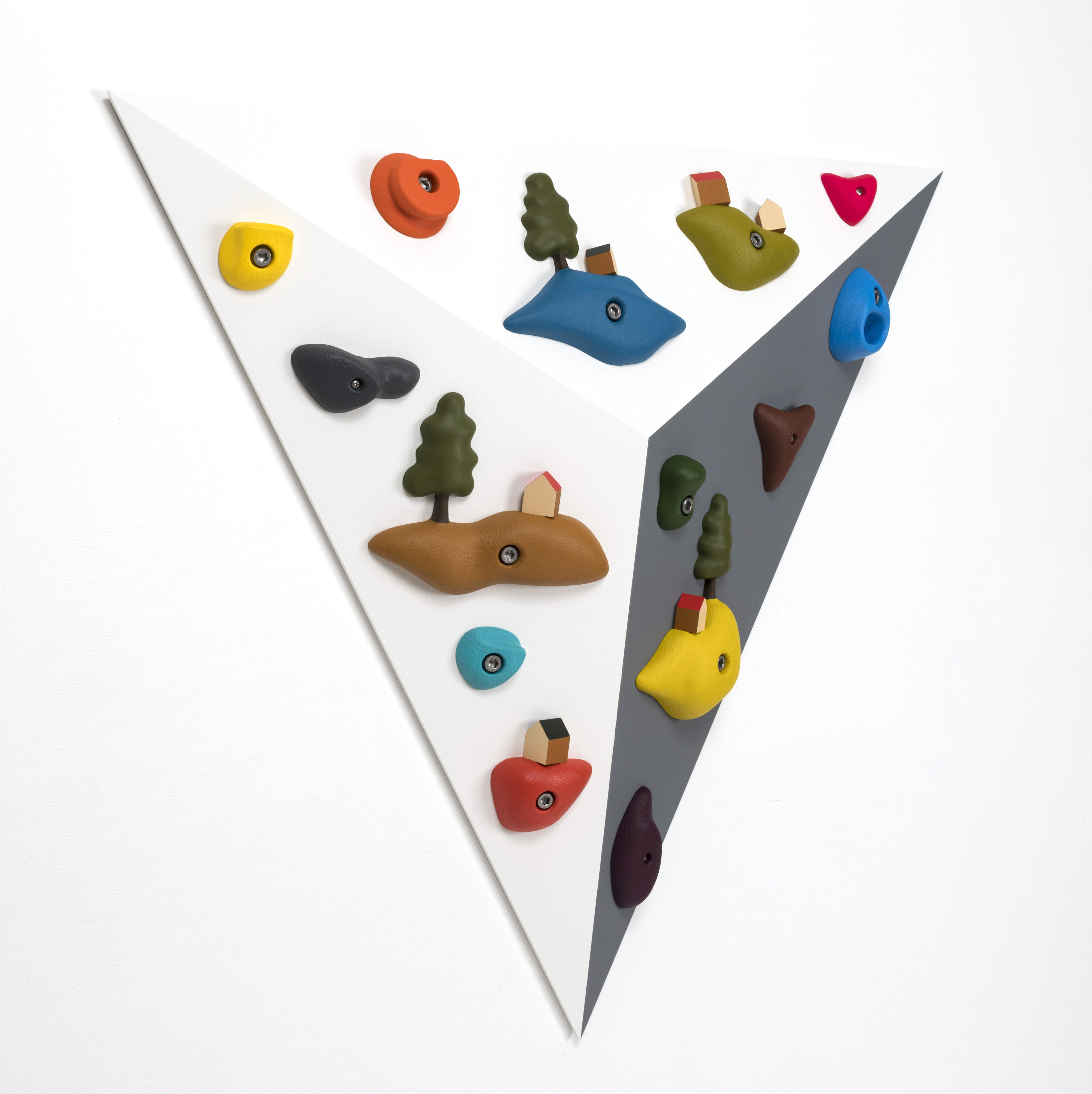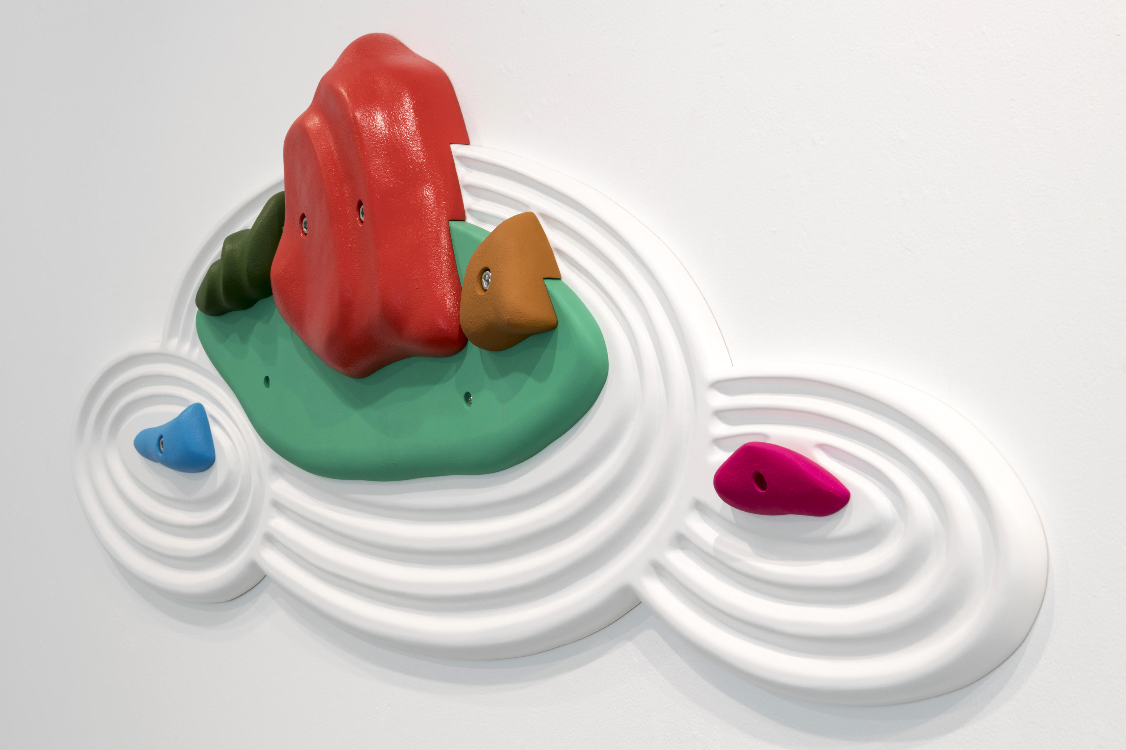それを経て、こちらの壁《Floating Island》は、実際にスポーツで登っているボルダリングの壁面を意識した作品です。市販のホールドと自分で作った造形を両方配置して壁面全体を一つの浮島の集まりみたいなもので構成しています。![]()